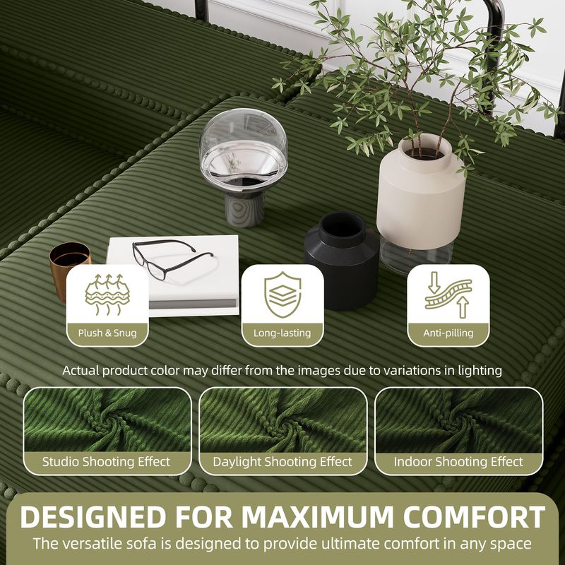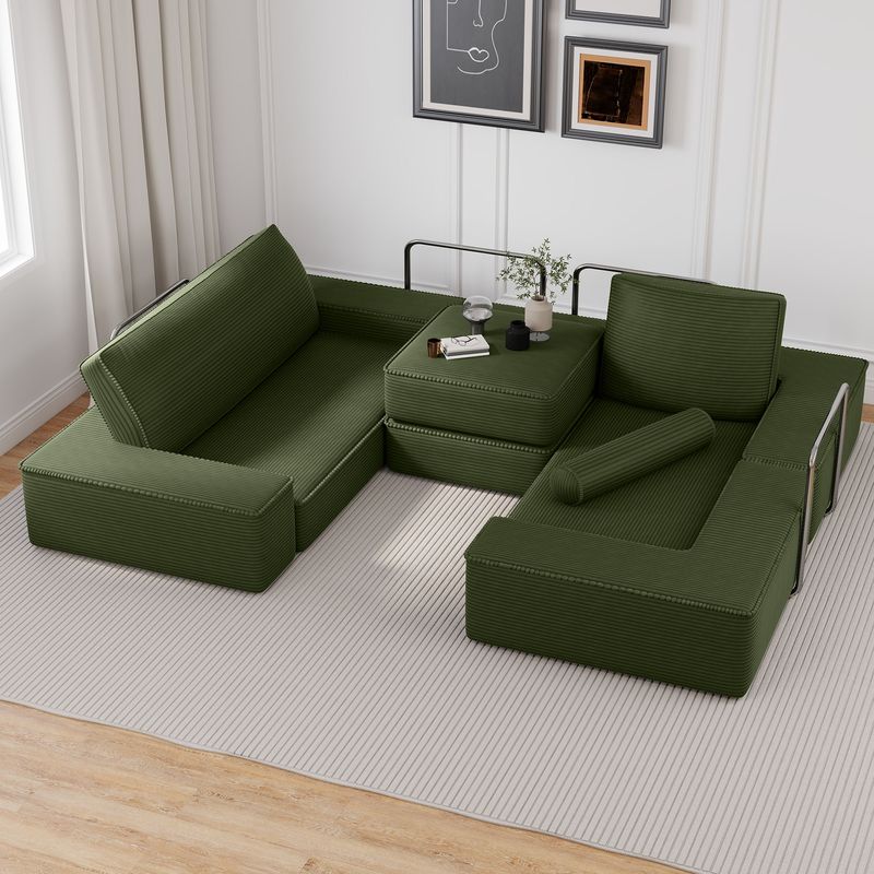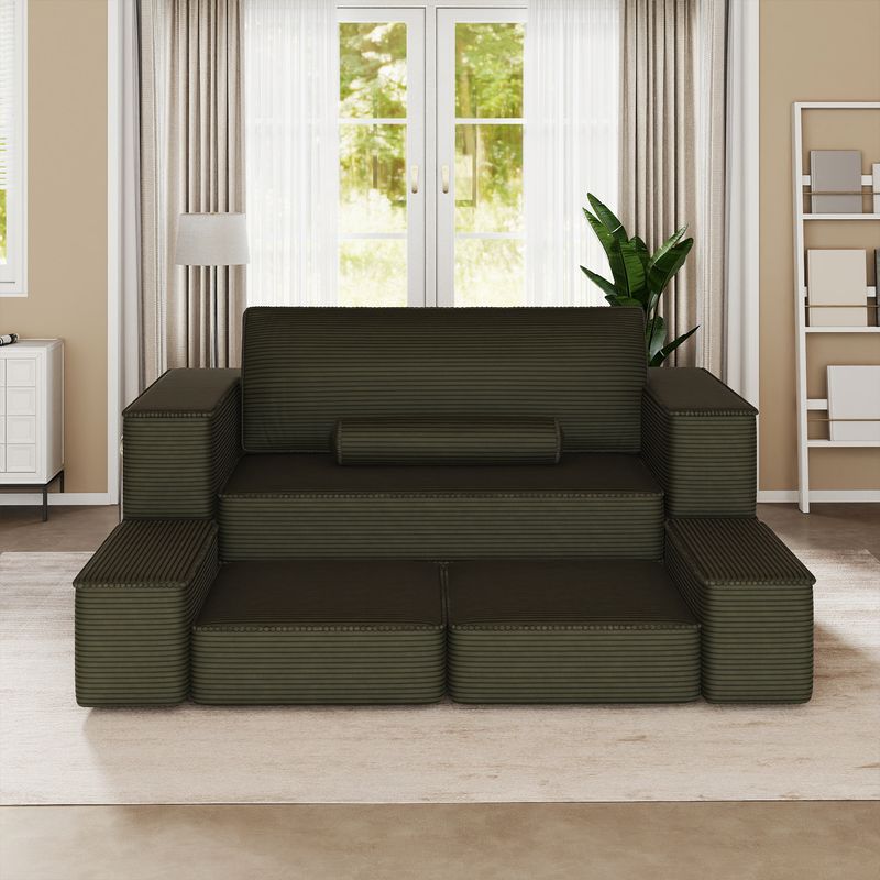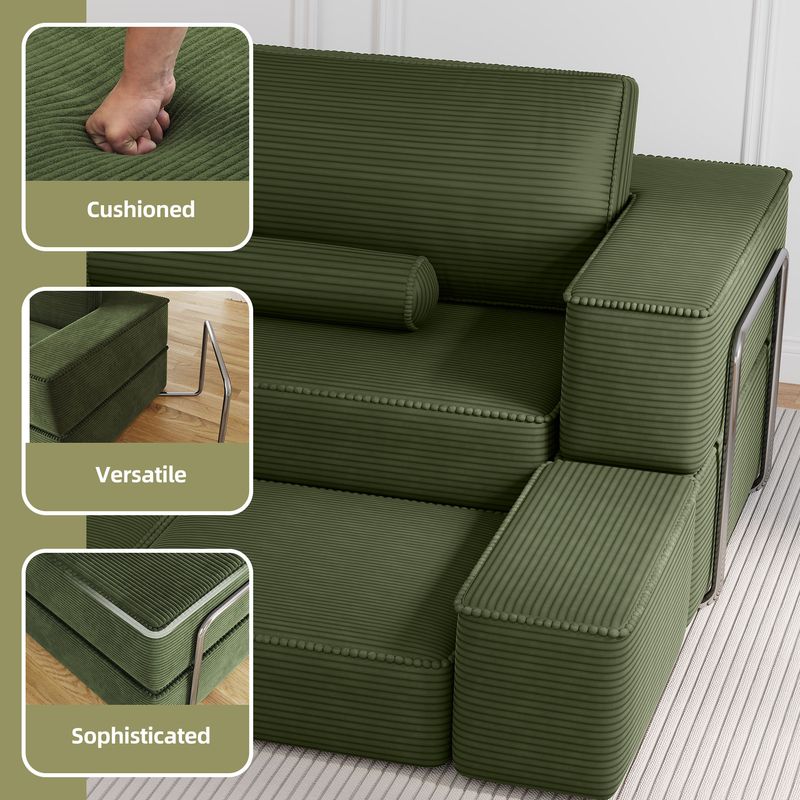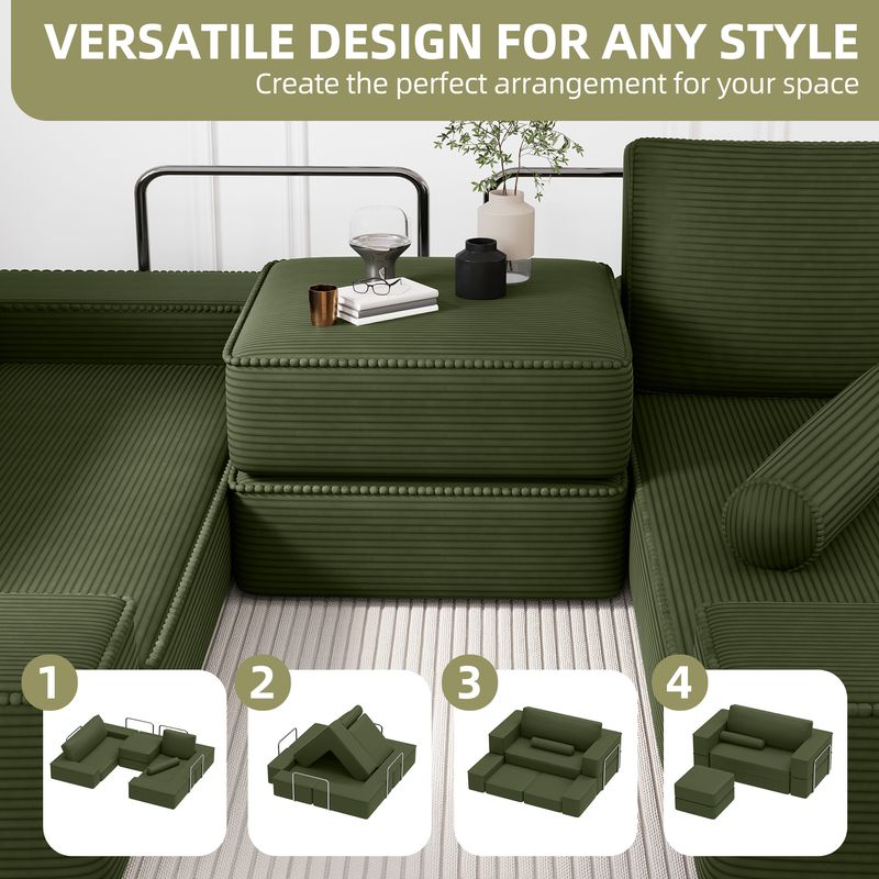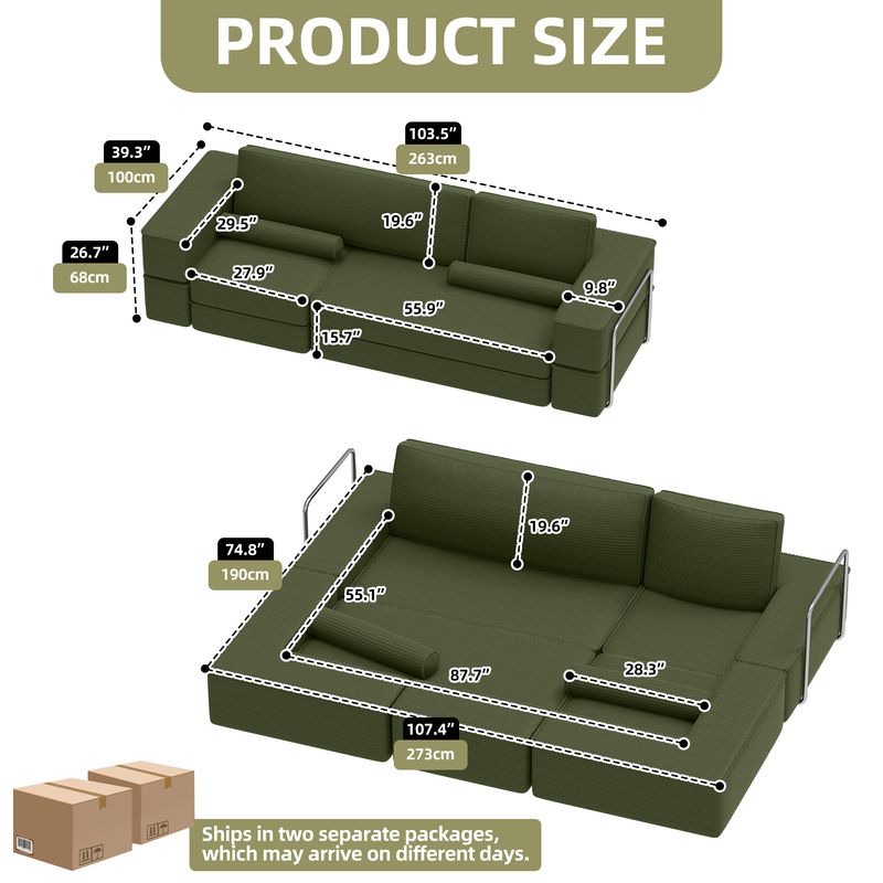 This 107.4" modular sofa bed or 103.5" modular sofa can transform into 10+ configurations using 15.7" spring foam cushions and pet-friendly corduroy fabric. Requires no assembly - just unbox and enjoy versatile seating, lounging, or sleeping options in any room.