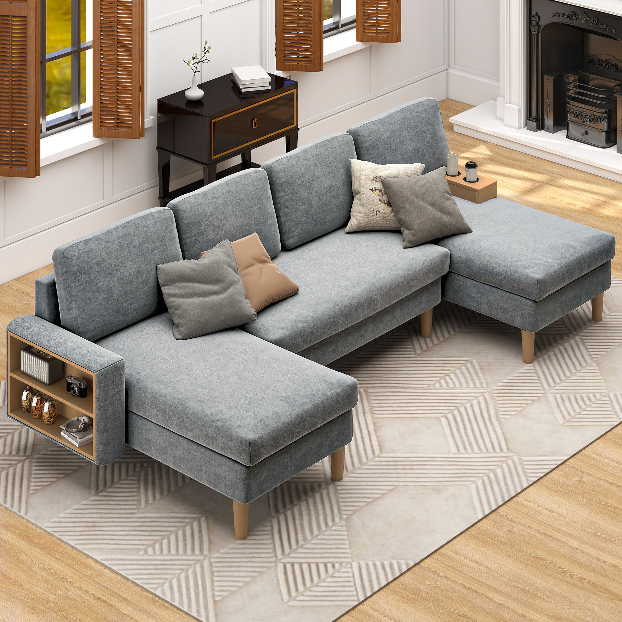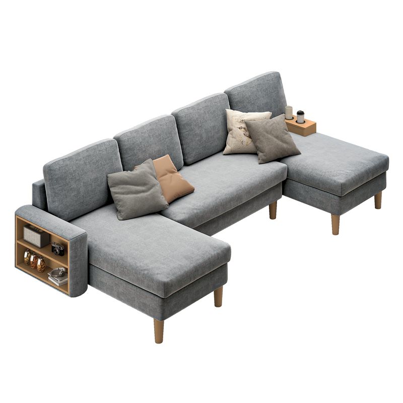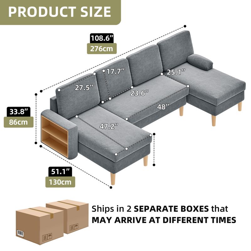This U-shaped sectional sofa features double chaise lounges and built-in storage, crafted with 28D high-resilience foam and S-spring support. Delivered in two vacuum-packed boxes for easy setup, it creates the perfect entertainment center for any living space.