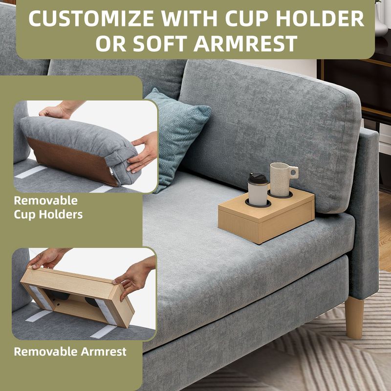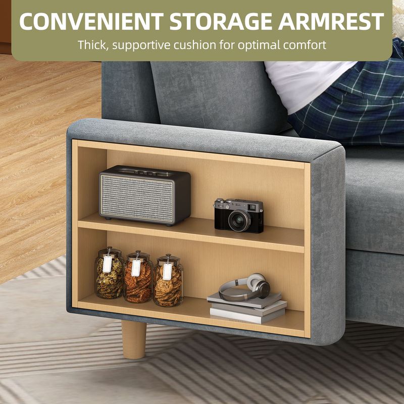 Hidden storage compartment in left armrest organizes remotes and books, while right armrest offers convertible design with optional cupholder for versatile use.
