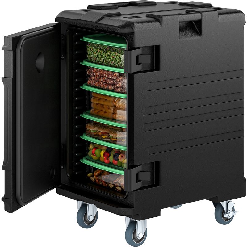 Insulated food pan carrier features a seamless double-wall shell that's made from highly heat and cold resistant LLDPE, inlaid sealing ring, and filled with premium polyurethane foam for maximum insulation performance; Ventilation holes on the door ensure perfect humidity before the food arrives