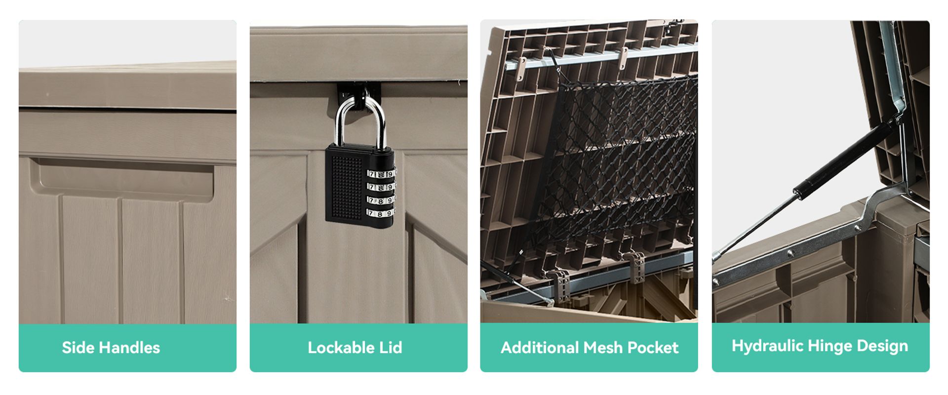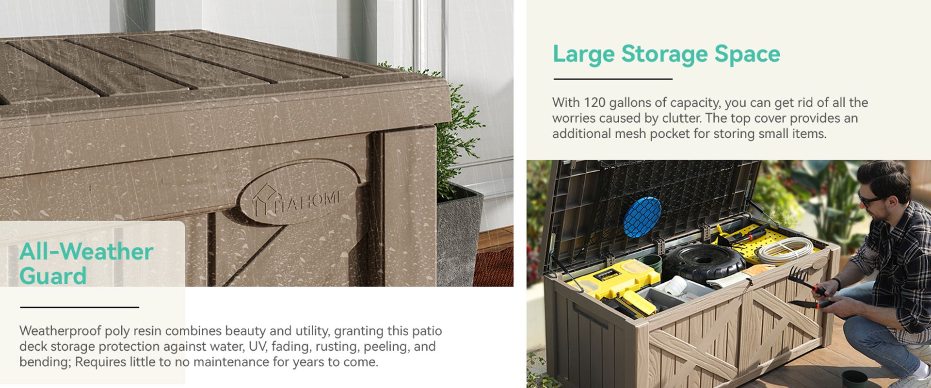 Weatherproof poly resin combines beauty and utility, granting this patio deck storage protection against water, UV, fading, rusting, peeling, and bending; Requires little to no maintenance for years to come.