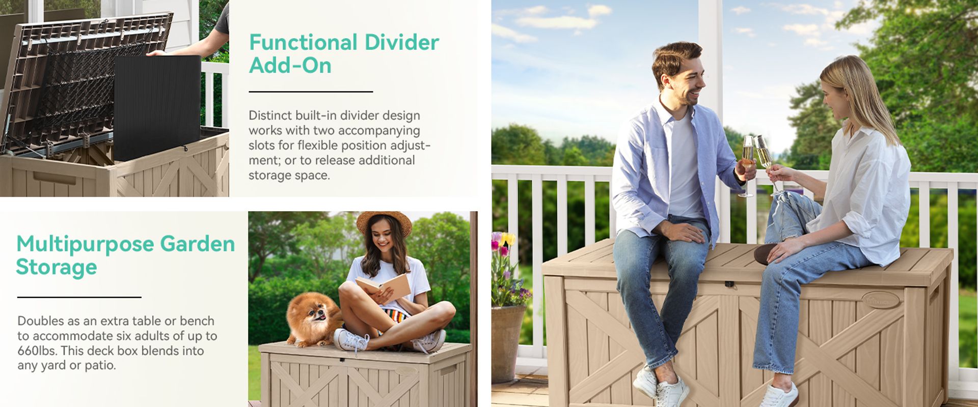 Doubles as an extra table or bench to accommodate six adults of up to 660lbs. This deck box blends into any yard or patio.