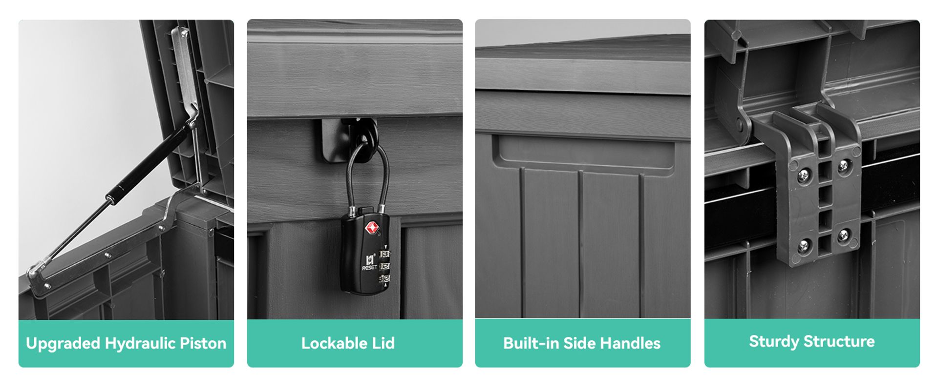 Structured with all weather-resistant resin that prevents fading and rusting; Added Iron rods for the deck box's extra support and strength.
