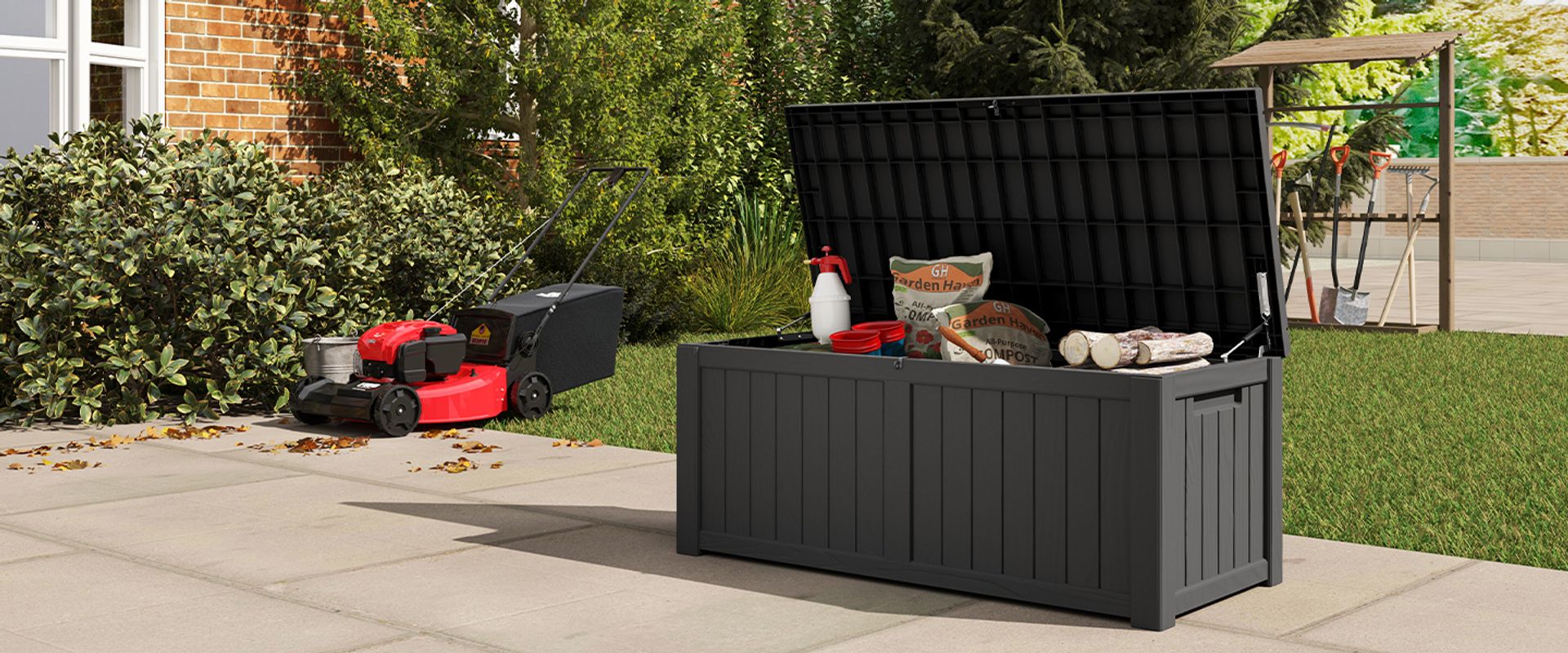 Perfect to store outdoor cushions, pool supplies, and gardening tools. A stylish design easily matches your other patio furniture.