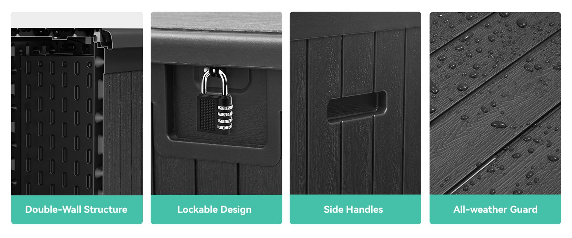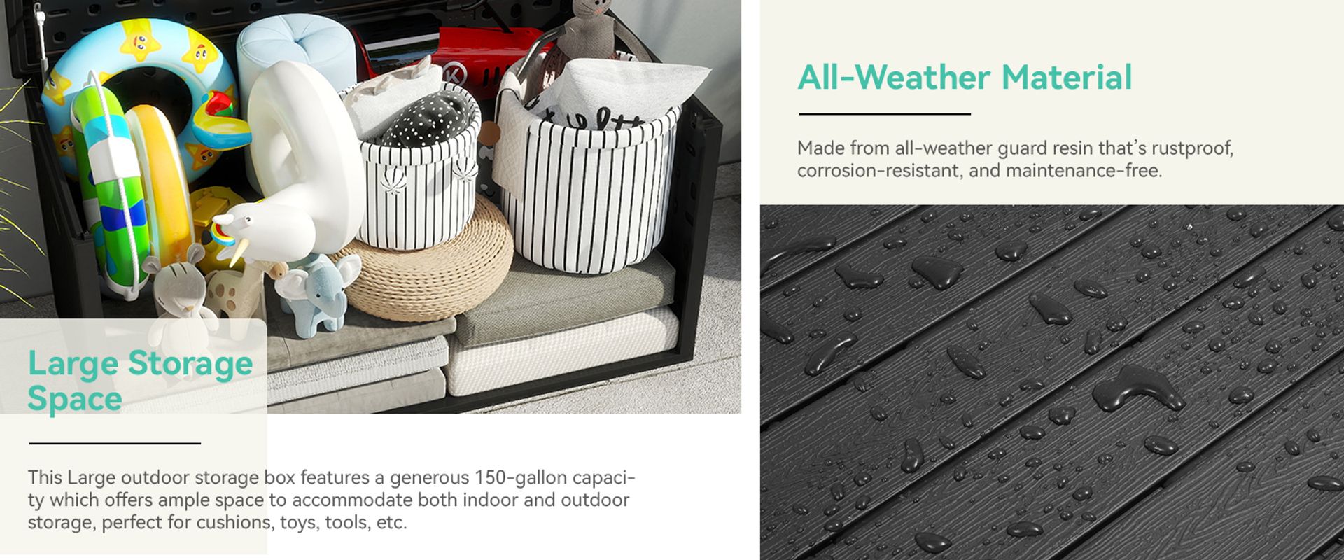 This Large outdoor storage box features a generous 150-gallon capacity which offers ample space to accommodate both indoor and outdoor storage, perfect for cushions, toys, tools, etc.