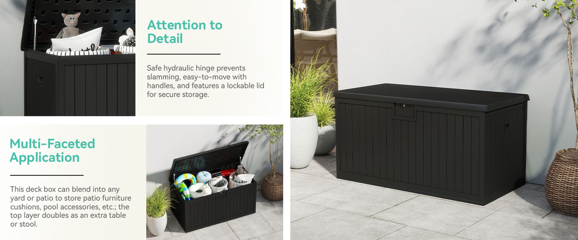 This deck box can blend into any yard or patio to store patio furniture cushions, outdoor toys, gardening tools, pool accessories, etc.; the top layer doubles as an extra table or stool.
