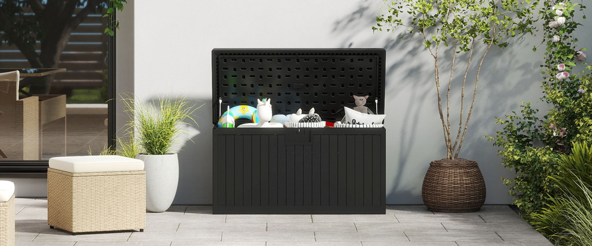 This large, multi-functional outdoor storage box is ideal for your garden, courtyard, or pool area. Features a 150-gallon capacity that conveniently holds large items such as garden tools, large cushions, or pool equipment. In addition to a spacious outdoor storage solution, this deck box is also a practical patio bench that can optimize your outdoor living space.