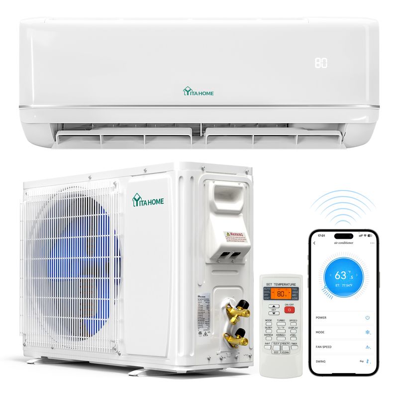 The 18,000 BTU White Smart Mini Split AC delivers powerful, energy-efficient cooling and heating with ETL and AHRI-certified performance. Featuring inverter technology (21 SEER2) and a high-power compressor, it covers 1,250 sq ft while saving 25% energy. Operates below 50dB with 5 modes including cool, heat, dry, fan, and auto, plus WiFi and Alexa control. Advanced features include iFEEL, self-cleaning, and PM2.5 filtration. Includes a 3M copper pipe, UL-certified power cord, and R32 refrigerant. Designed for year-round comfort in temperatures from 5°F to 118°F.