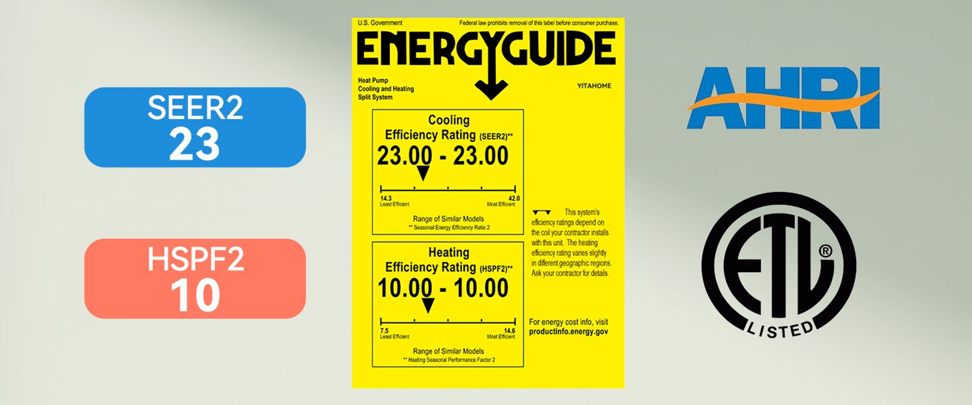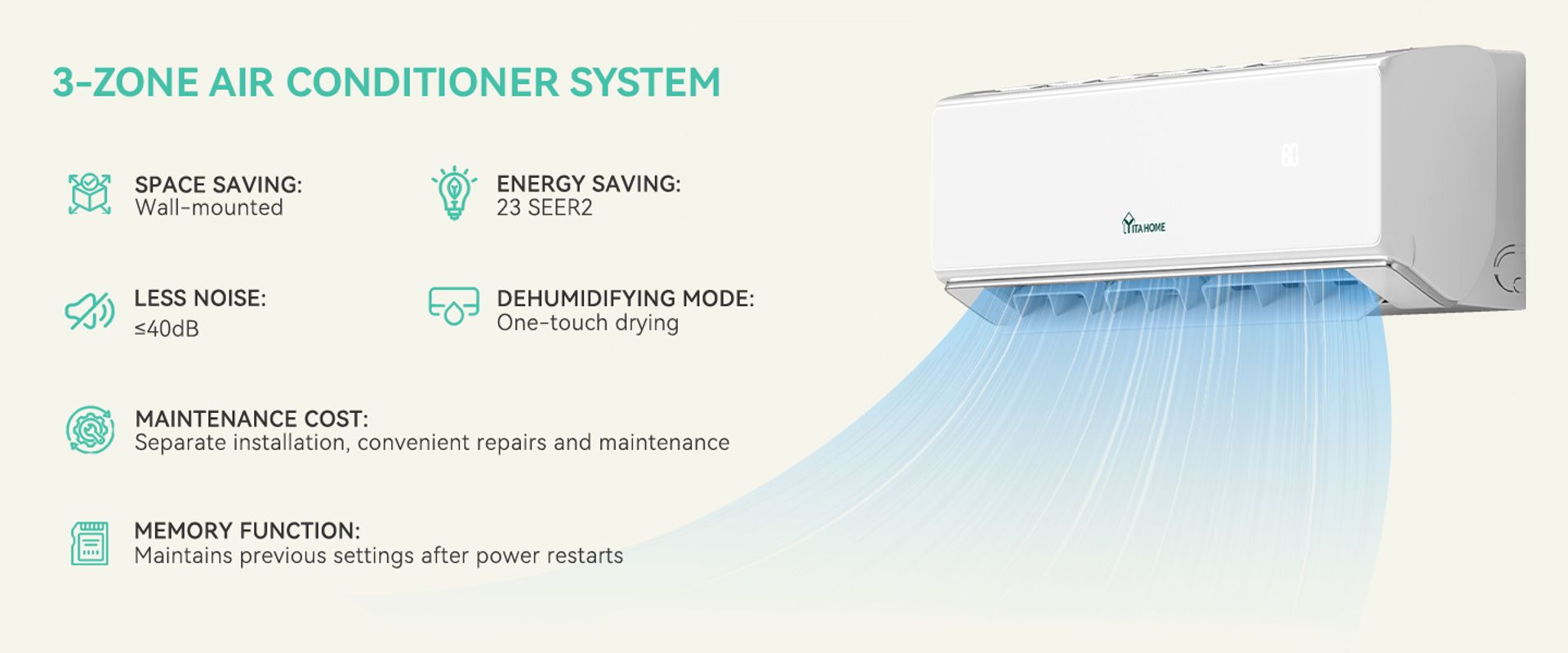 With 3 separate 23 SEER2 indoor units connected to the outdoor unit; Equipped with a high-power compressor and heat pump; Applyed innovative inverter technology with 25% energy savings; Covers 800 square feet, ideal for various indoor scenes; ETL and AHRI certified.