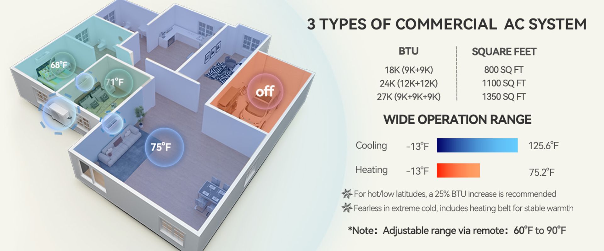 The remote control allows you to set the temperature between 60°F and 90°F. The mini split system is designed to perform in various environments at temperatures between 5°F and 118°F, providing optimal performance in every season.