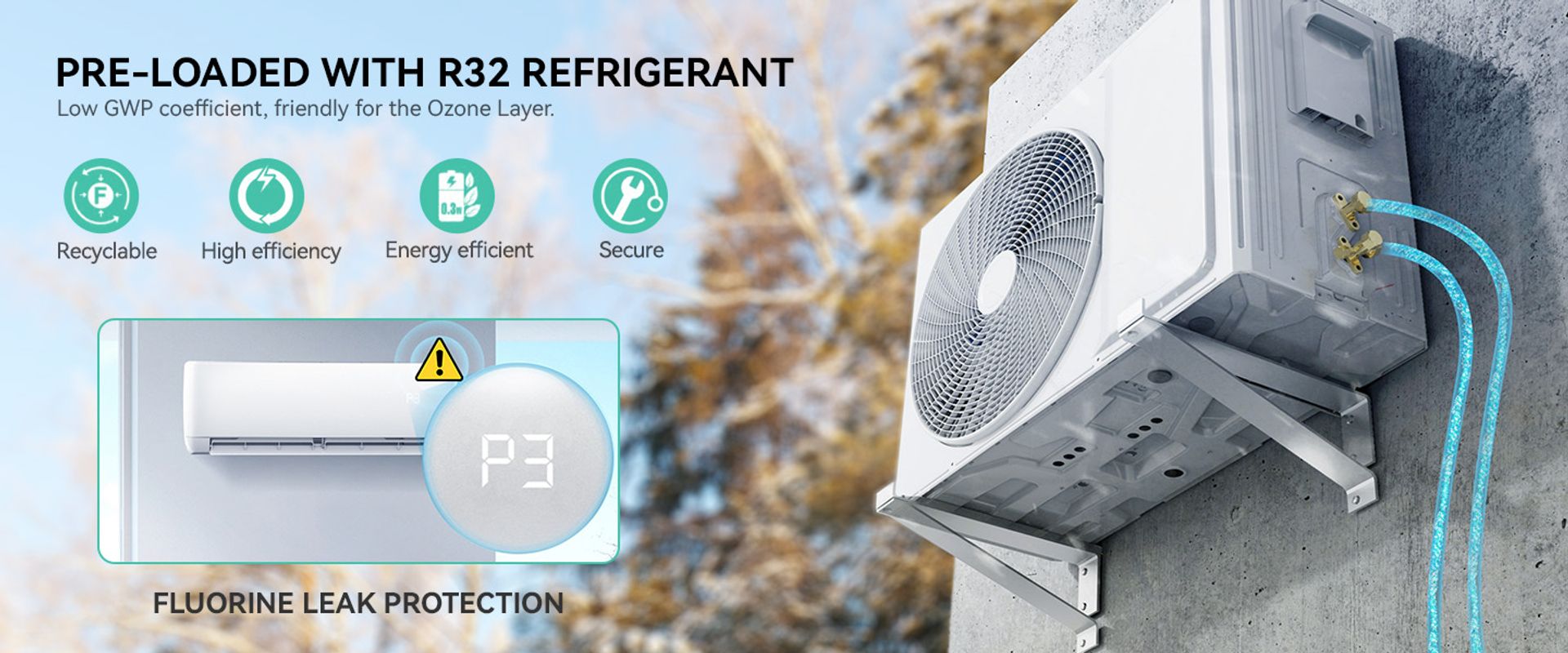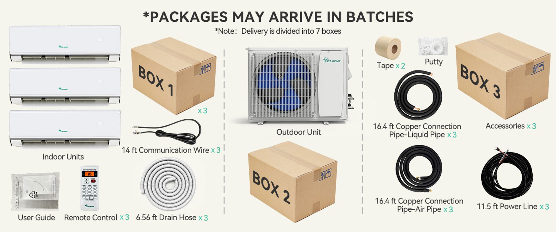 Our 3-zone mini split ac system comes with 3 indoor units, outdoor unit, remote controls, and comprehensive installation kit; Pre-charged with environmental friendly R32 refrigerant; Professional installation is required.