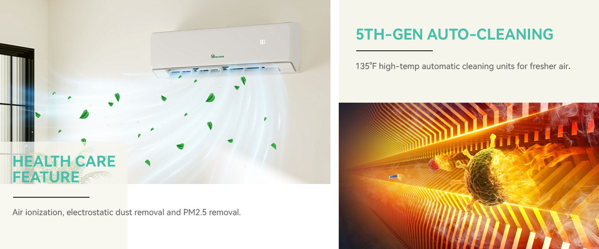 The mini split air conditioner and heater units offer five modes (auto/cool/dry/heat/fan); WiFi-enabled and Alexa-compatible; Automatic defrosting, self-diagnosis/cleaning, iFEEL mode, 24-hour timer, sleep mode, energy-saving mode, "HEALTH" mode (negative ions, electrostatic dust removal, and PM2.5 removal)