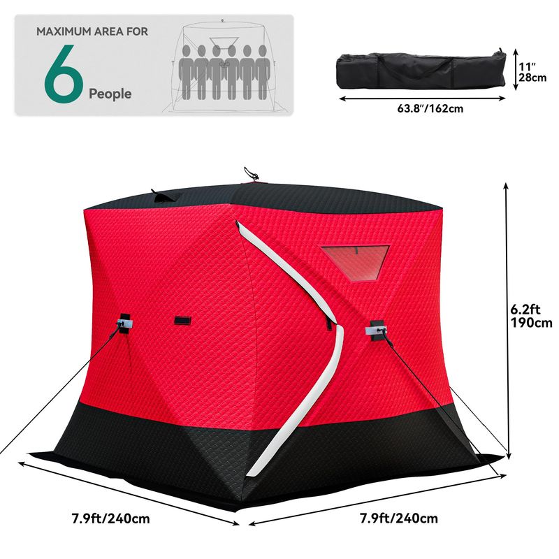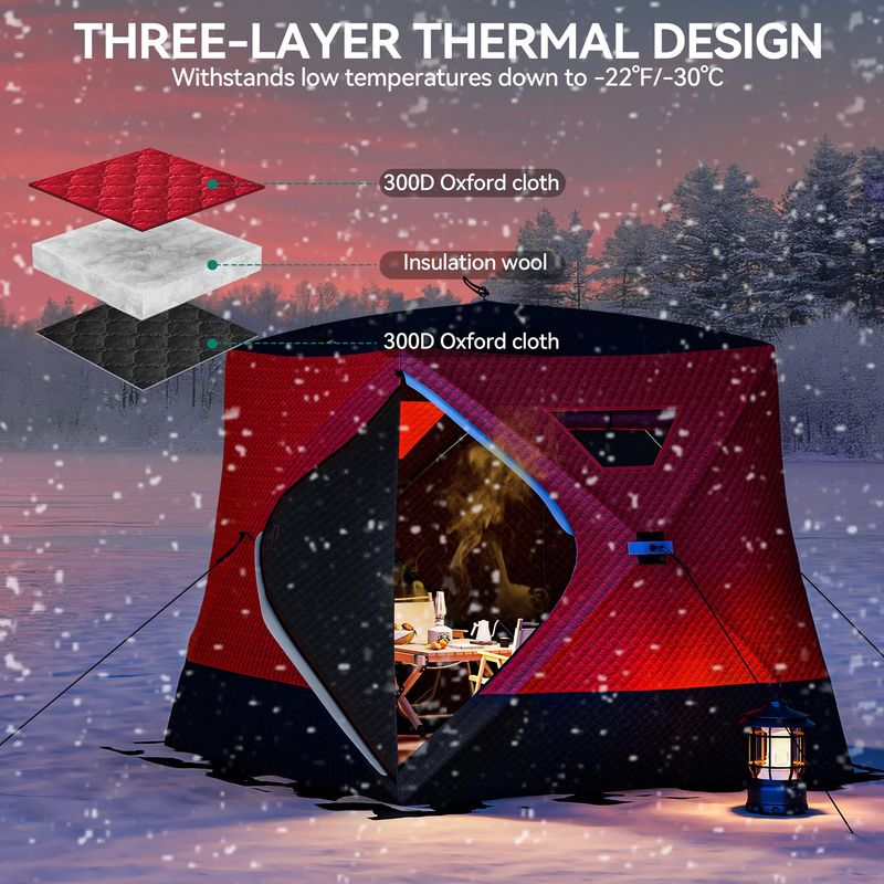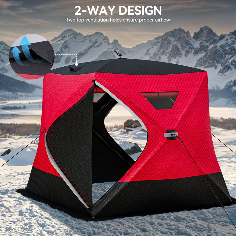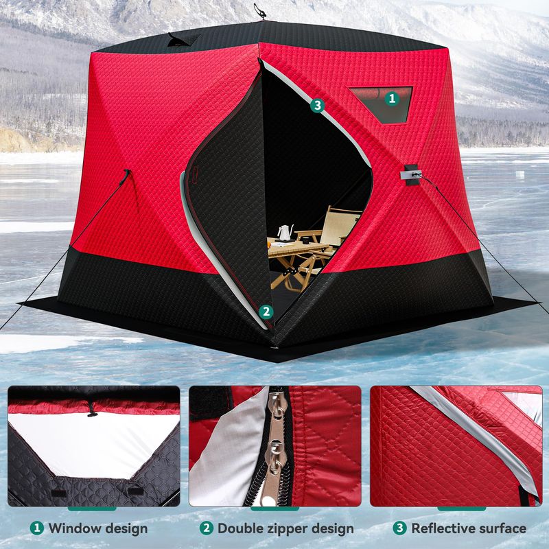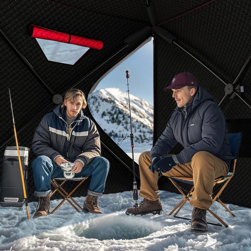 With instant pop-up setup, our 5-6 person ice fishing shelter combines 3-layer insulated protection with a robust, windproof structure. Featuring 63 sq ft of space, PVC windows, vents, and a full accessory kit, it ensures a warm, stable, and comfortable fishing experience in harsh winter conditions.