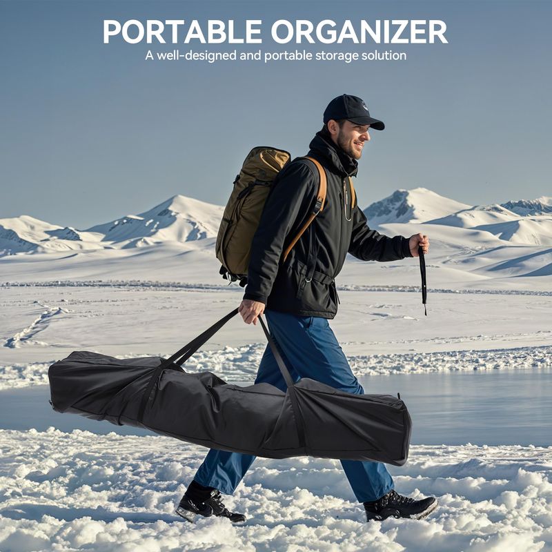 This ice fishing shelter sets up and stores easily, complete with 8 ice anchors, 4 wind ropes, and a carrying bag for convenient transport.