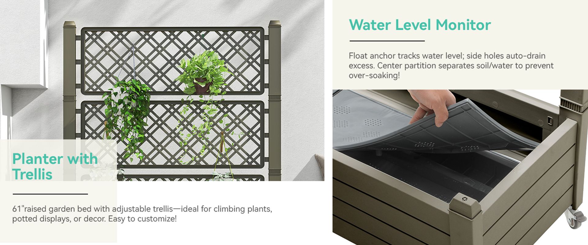 61" raised garden bed with adjustable trellis—ideal for climbing plants, potted displays, or decor. Easy to customize!