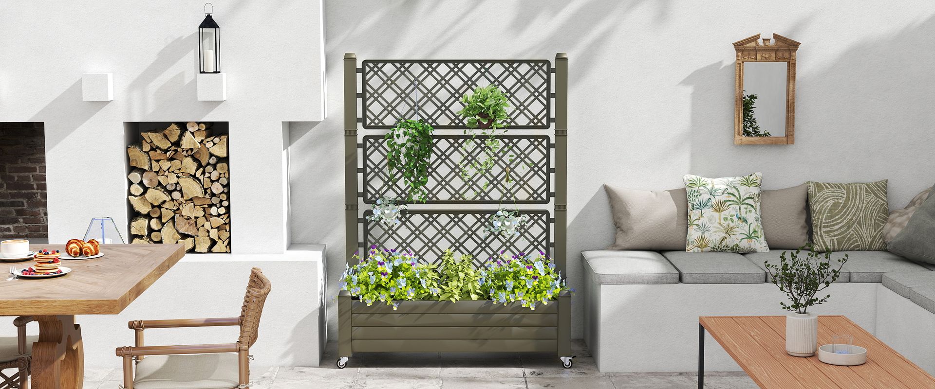 3.6x1.5x5ft Outdoor Resin Raised Planter Box with Trellis and Wheels