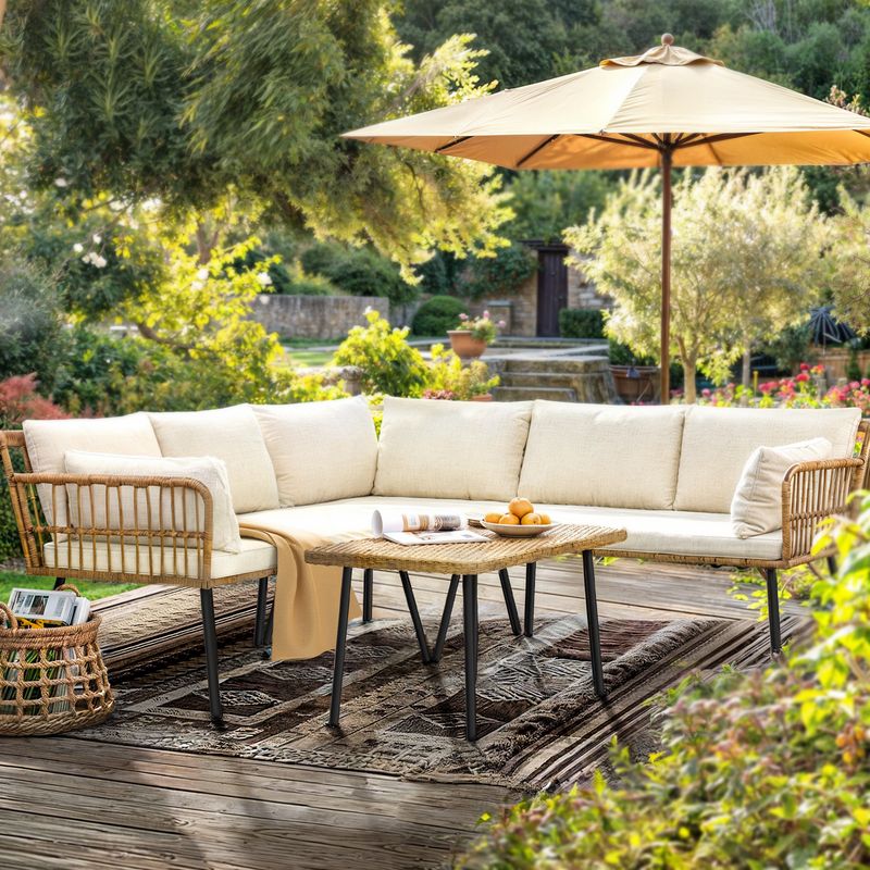 The L-shaped 4-piece patio sectional is an ideal fit in any corner of your porch or patio but can stand on its own in the open, showing off the open weave on its slim frame. Crafted with a weather-resistant powder-coated steel frame, each piece is wrapped in rattan wicker with contrasting brown that pairs beautifully with the black frame.