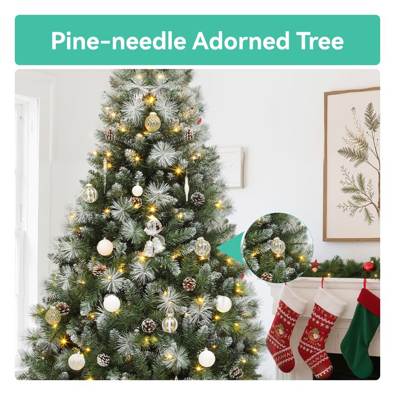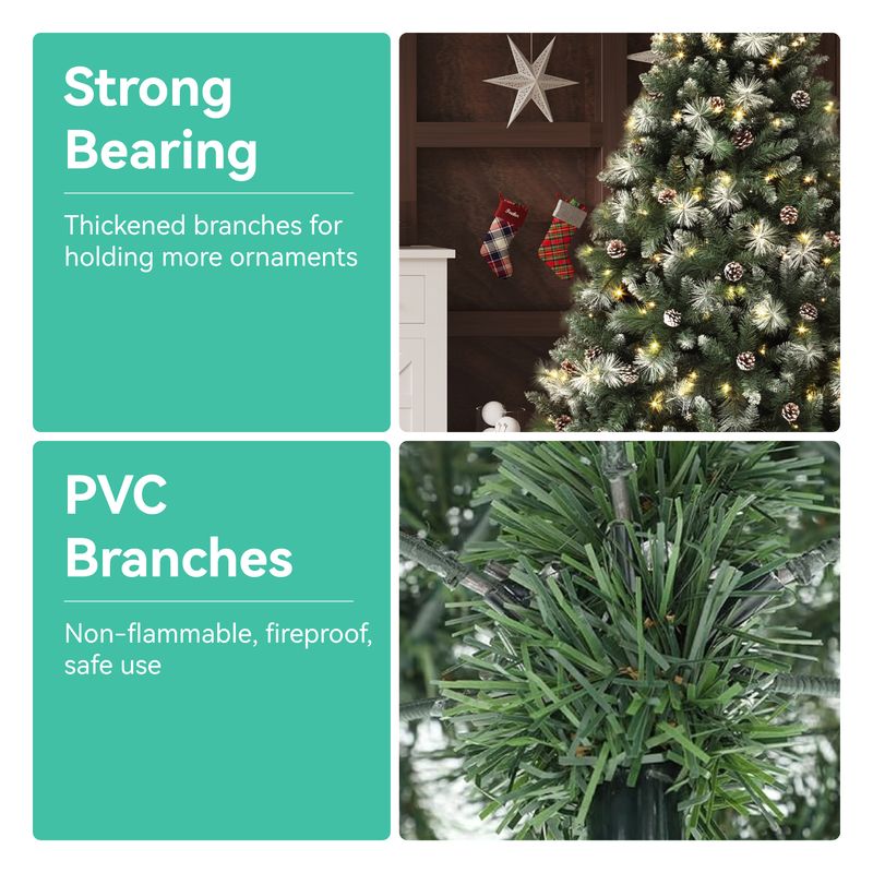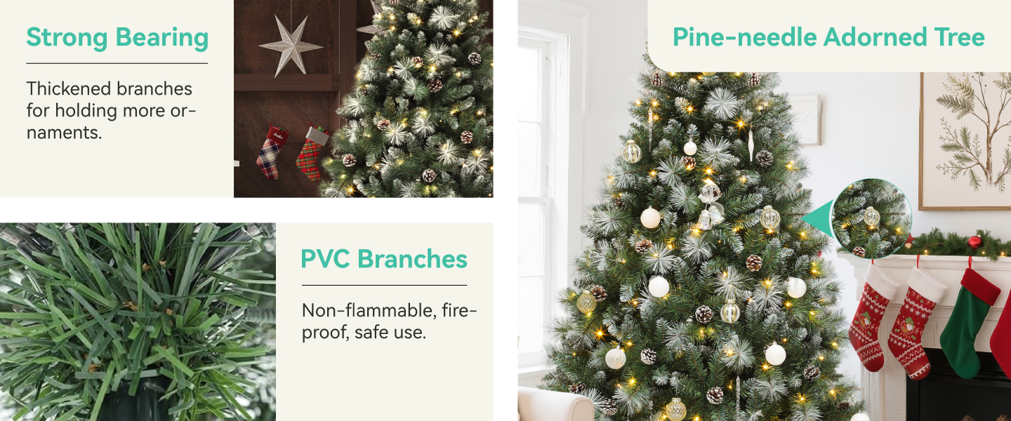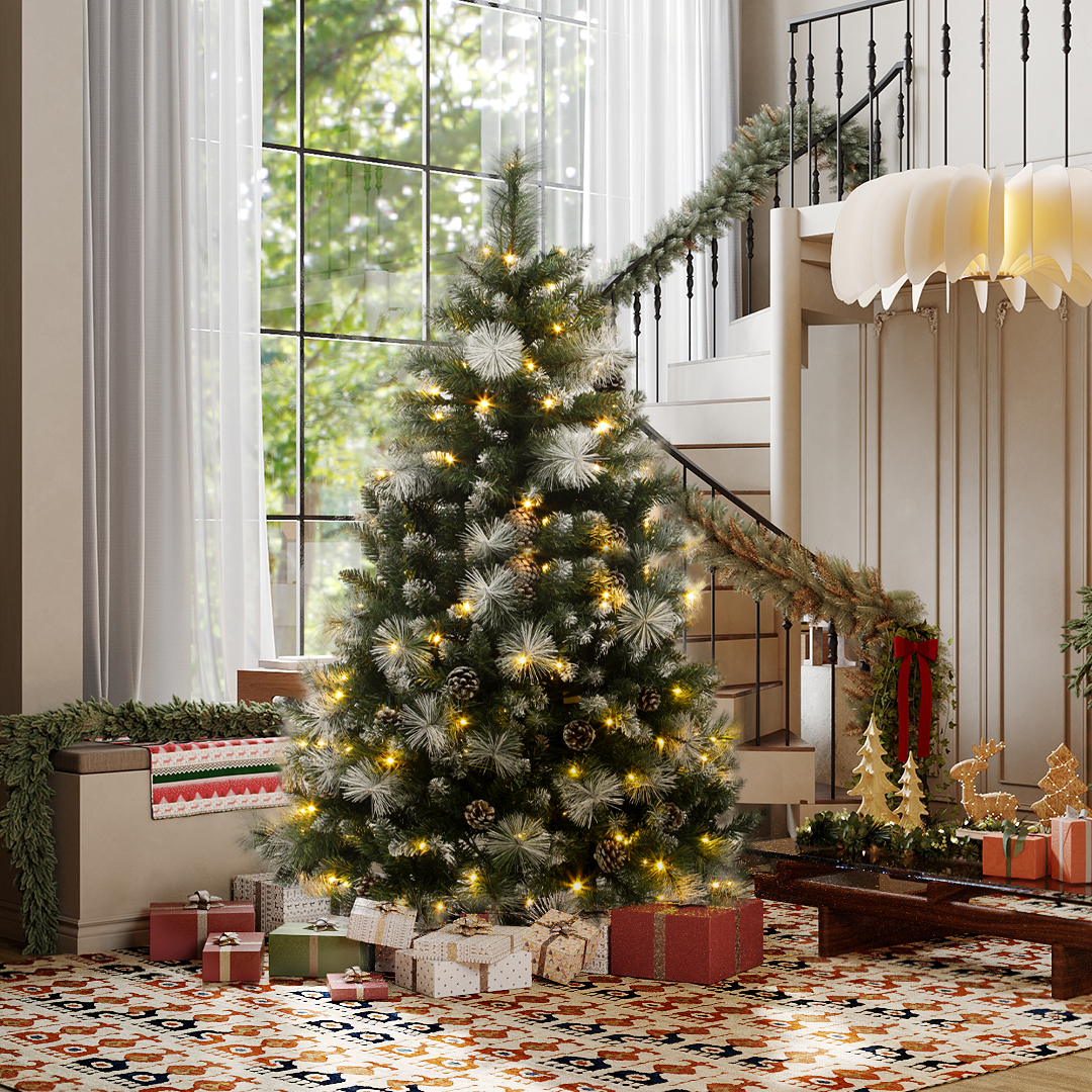 4.5 ft tall with 396 PVC tips, pinecones, and lush green needles, this pre-lit, pre-decorated tree brings a natural winter forest look indoors.