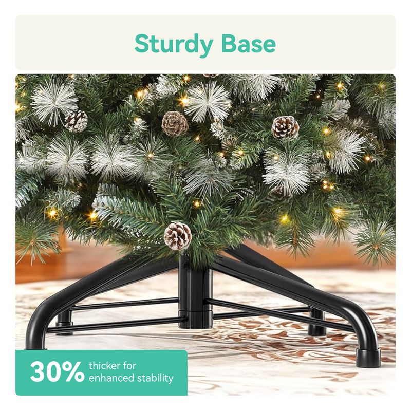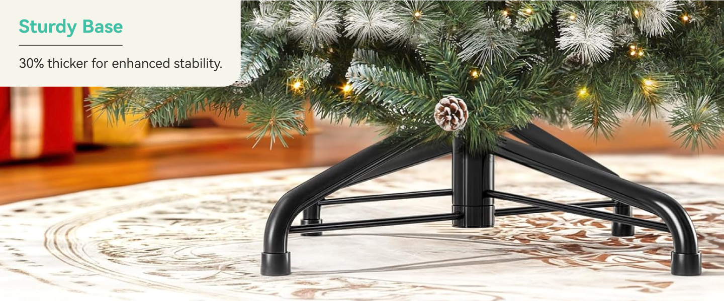 An X-shaped iron stand and reinforced base keep the tree stable, while strong branches hold ornaments securely for many seasons.