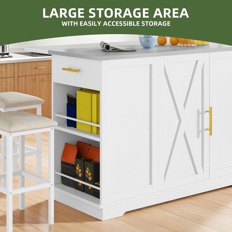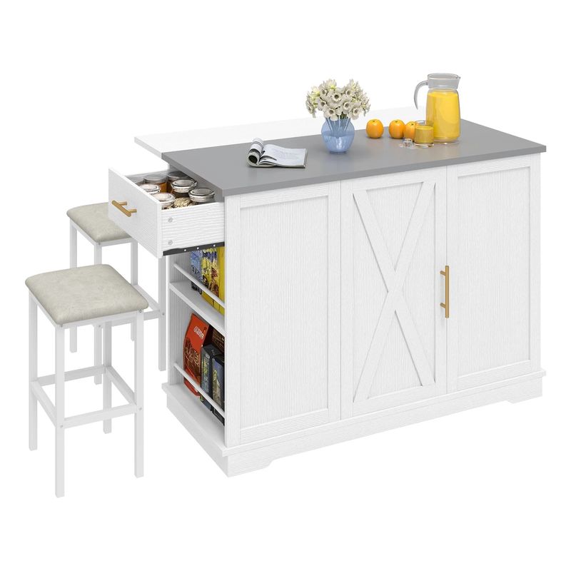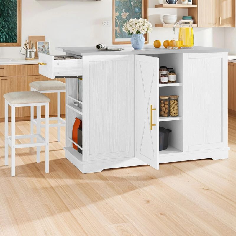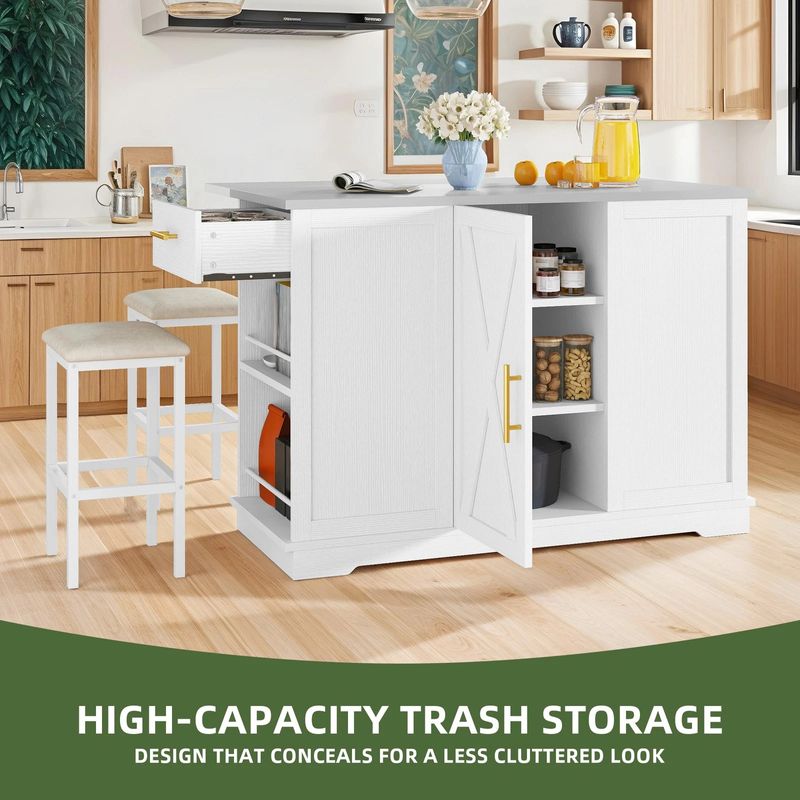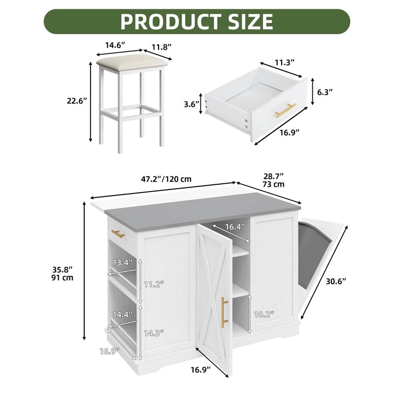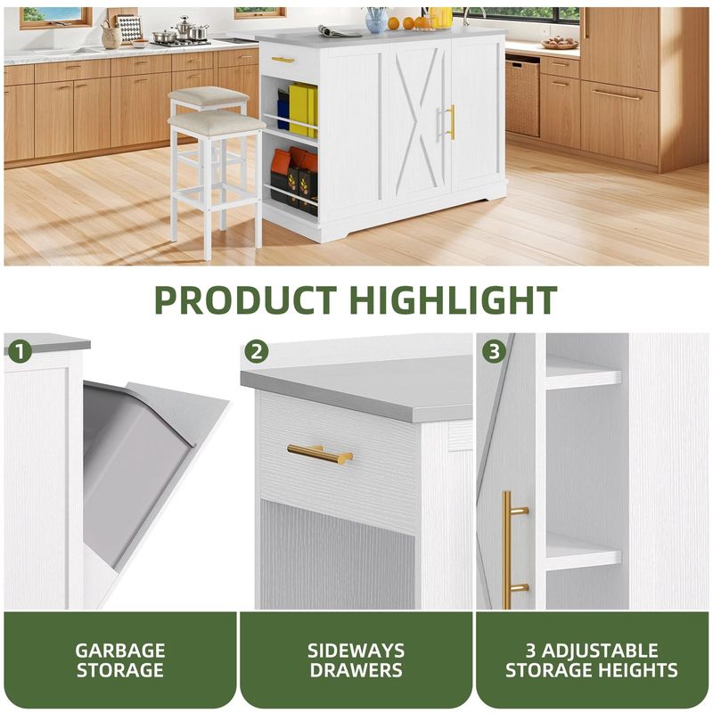 This multifunctional kitchen island combines storage, dining, and convenience with a spacious cabinet, smooth quiet drawers, a hidden trash bin, and durable construction. Complete with two comfortable bar stools, it’s perfect for cooking, casual meals, and entertaining in style.