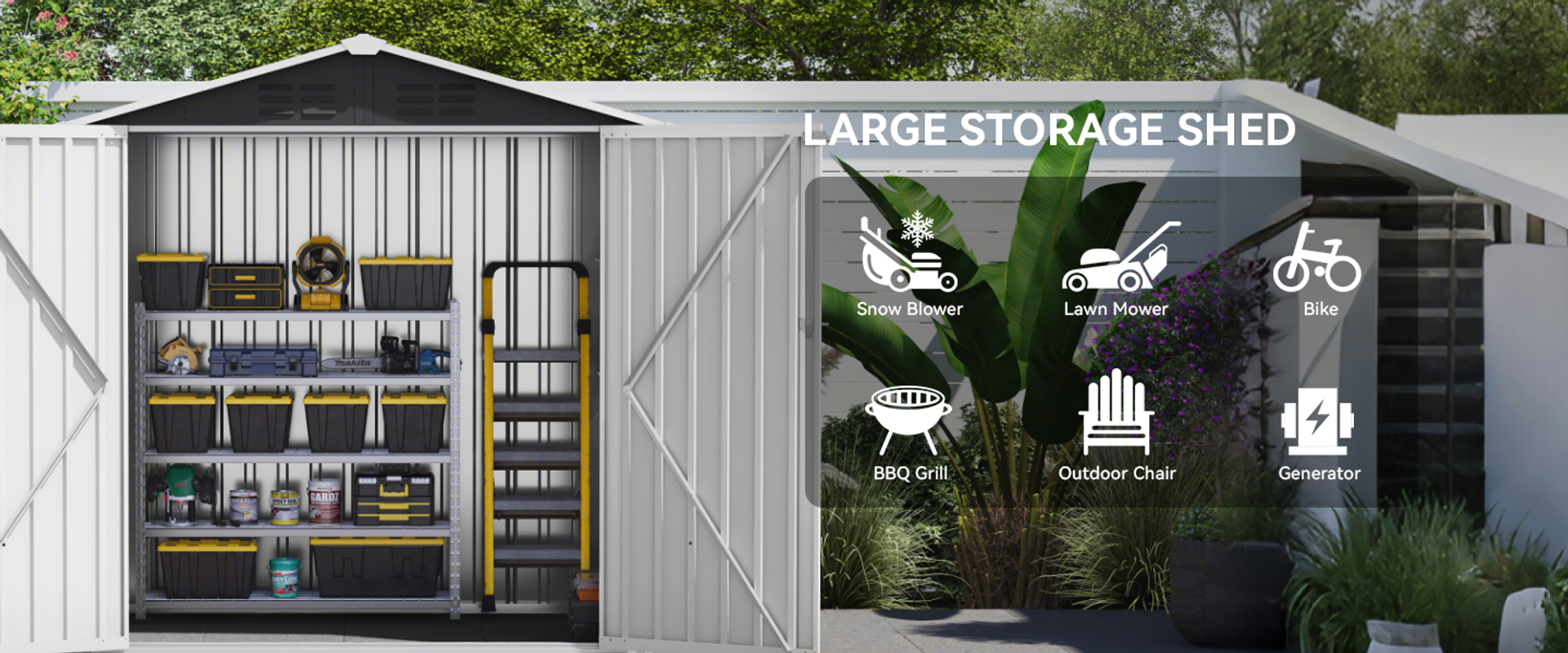Spacious and durable outdoor storage shed with 140 cu.ft capacity—ideal for tools, bikes, or even pets. Features weather-resistant galvanized steel, lockable doors, natural lighting, and ventilation. Easy to assemble for year-round protection.