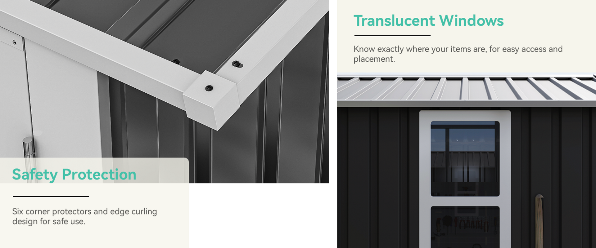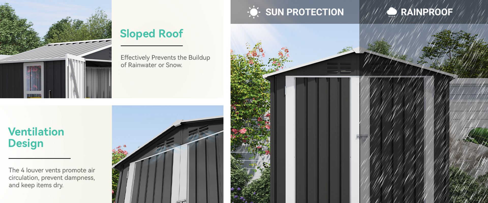 Translucent front windows let in natural light, while built-in vents promote airflow. The sloped roof design prevents water buildup, protecting your stored items from moisture damage.