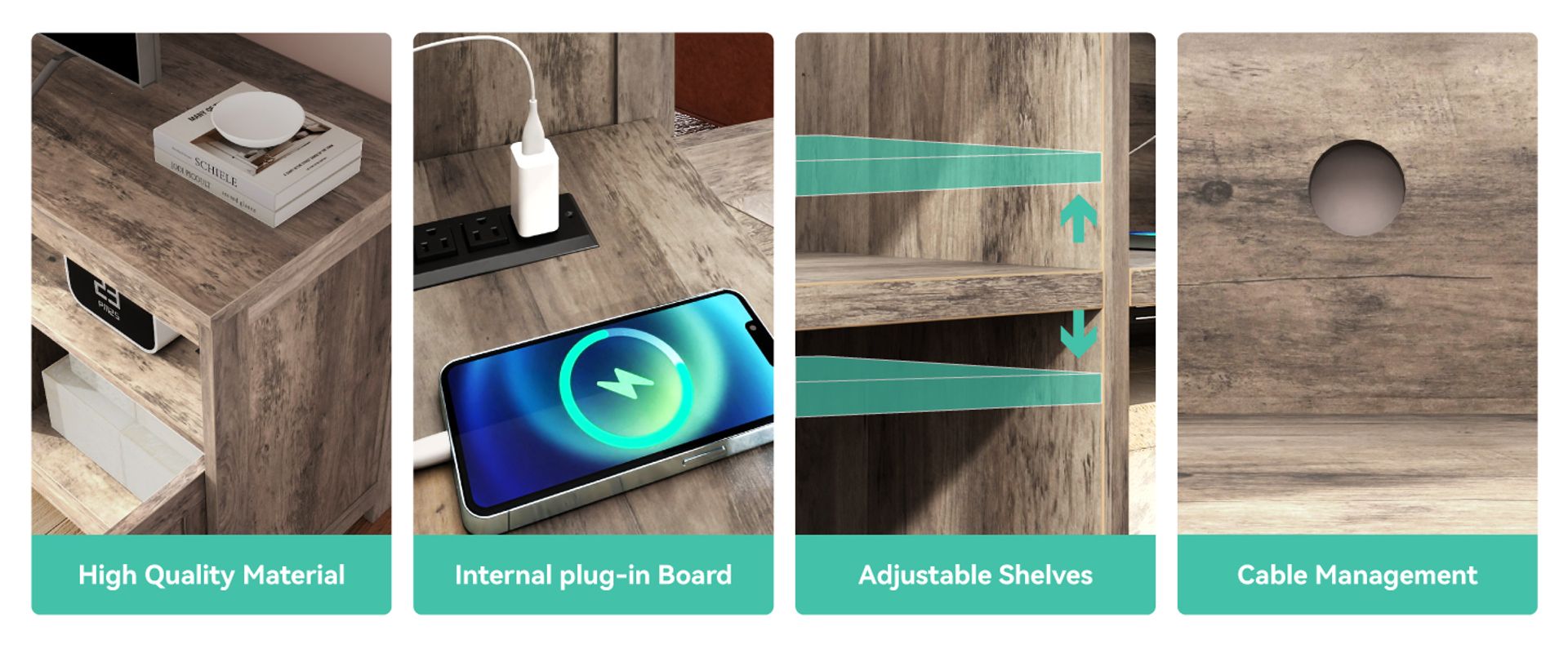 TV stand with adjustable shelves, 4 outlets, and 2 USB ports for personalized storage and power access.