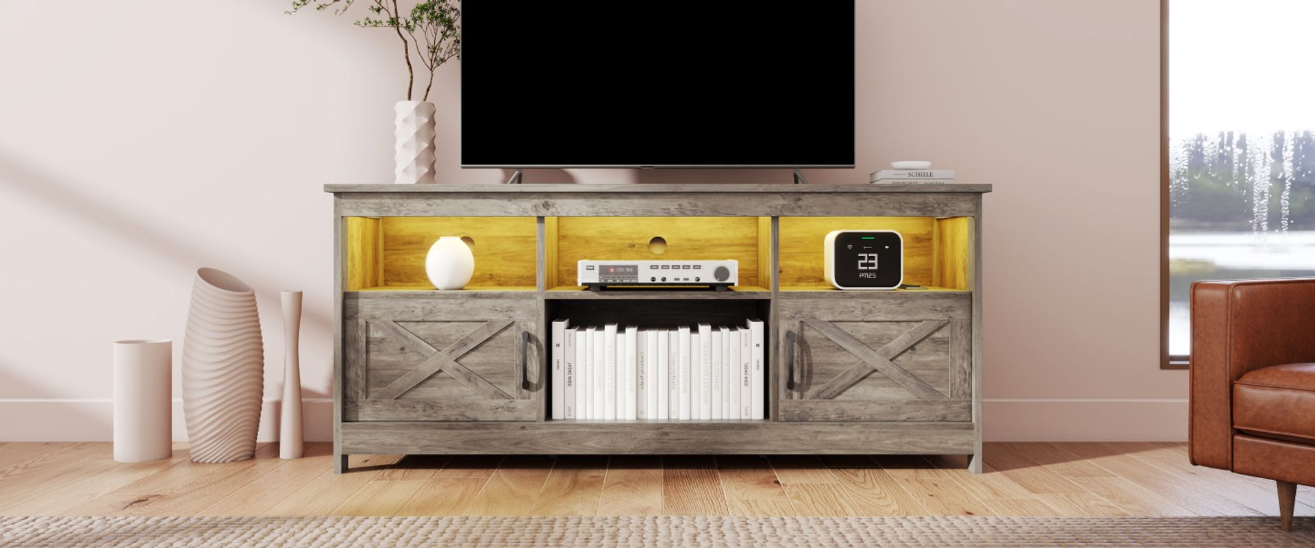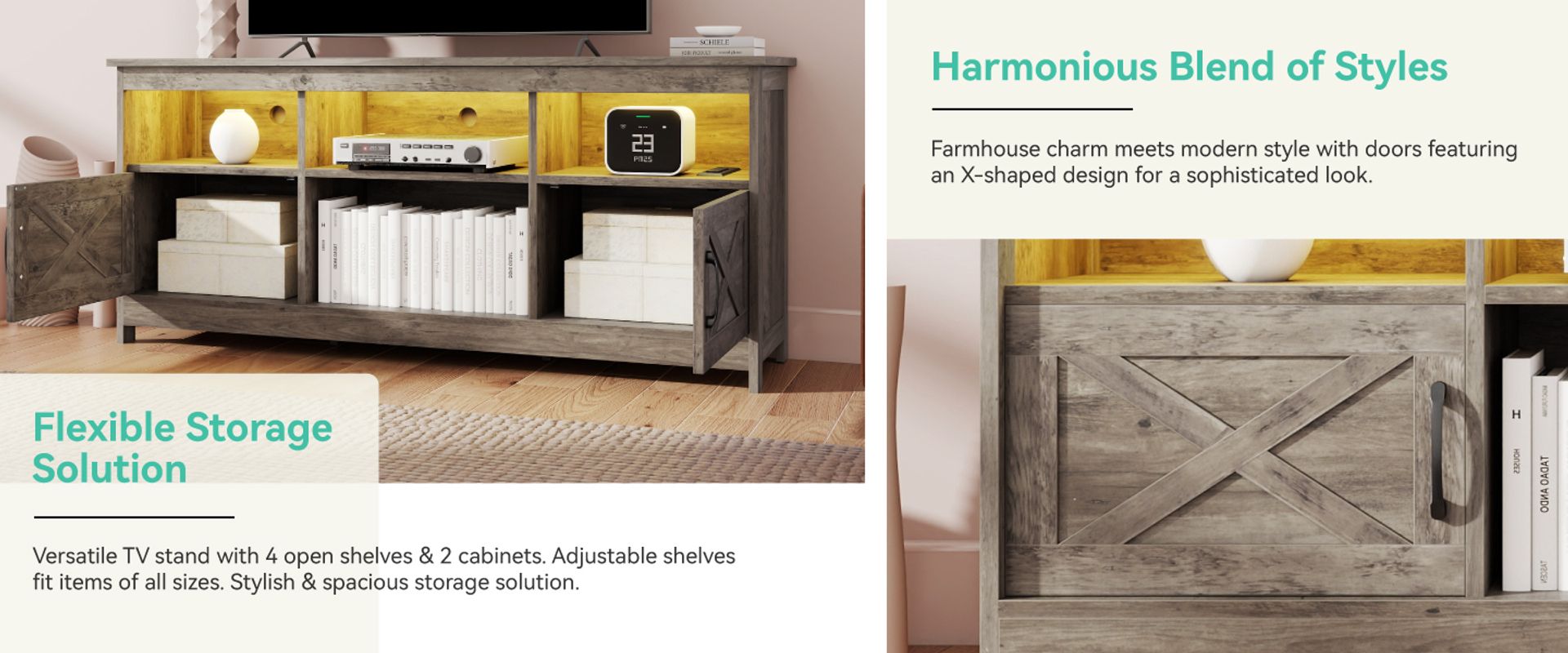 light grey tv stand, tv stand with storage, farmhouse tv stand​, tv stand with adjustable shelves, tv stand with open shelves, tv stand with adjustable shelves, tv stand for 65 inch tv