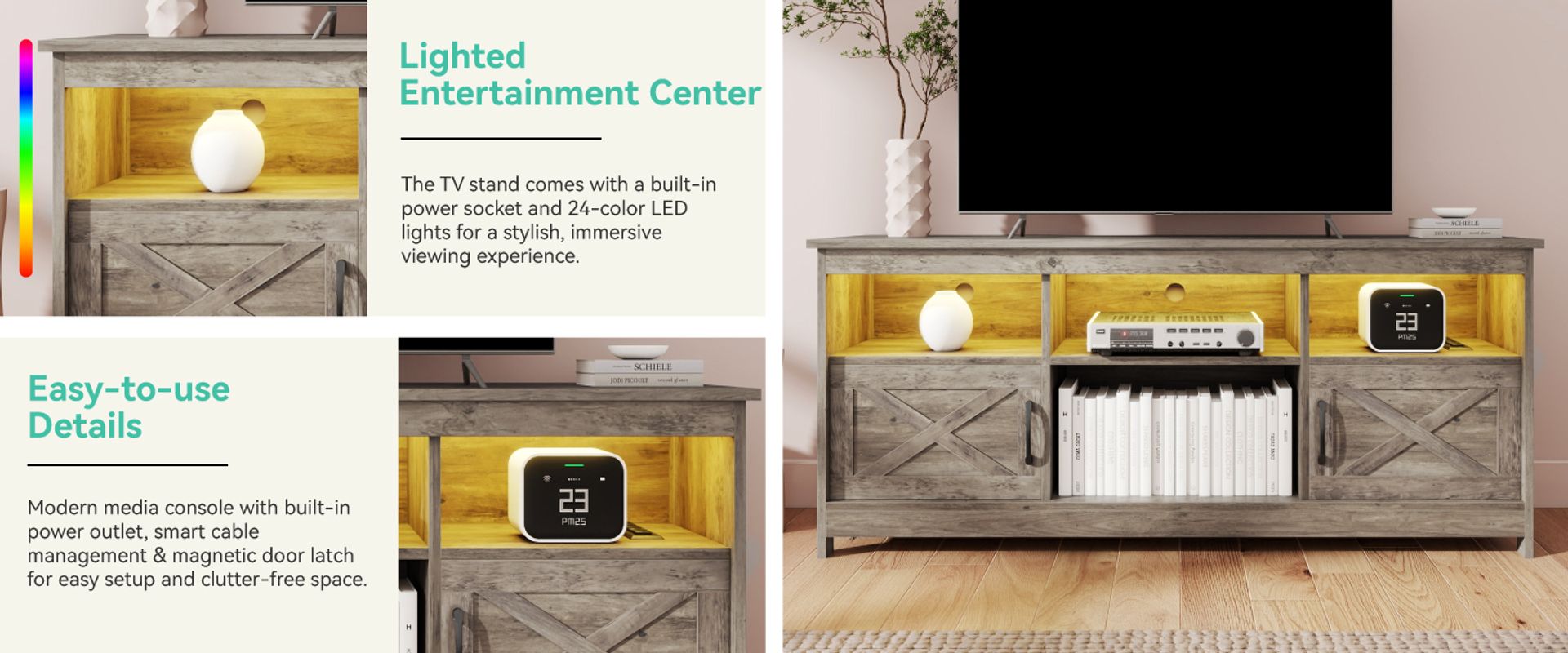 TV stand with built-in power socket and 24-color LED lights for a stylish, immersive viewing experience.