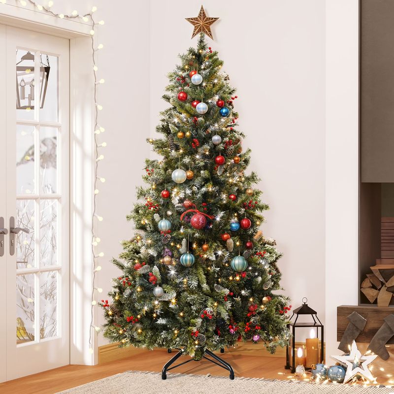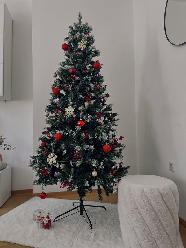 Revel in the vibrant and full presence of our 6ft pre-lit, pre-decorated pine hinged artificial Christmas tree, adorned with 818 lush flocked frosted tips, 58 natural pine cones, and 58 vivid red berries for an enchanting holiday atmosphere.