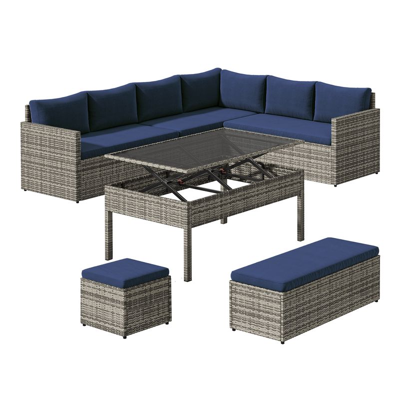 Our L-Shaped Wicker Sectional Sofa Set features a durable wicker frame, plush cushions, and a versatile lift-top table with a tempered glass top, offering ample space for dining, working, or leisure. The customizable layout allows you to arrange the sectional pieces—corner loveseats, single armrest loveseats, bench, ottoman, and table—to suit your indoor or outdoor space perfectly.