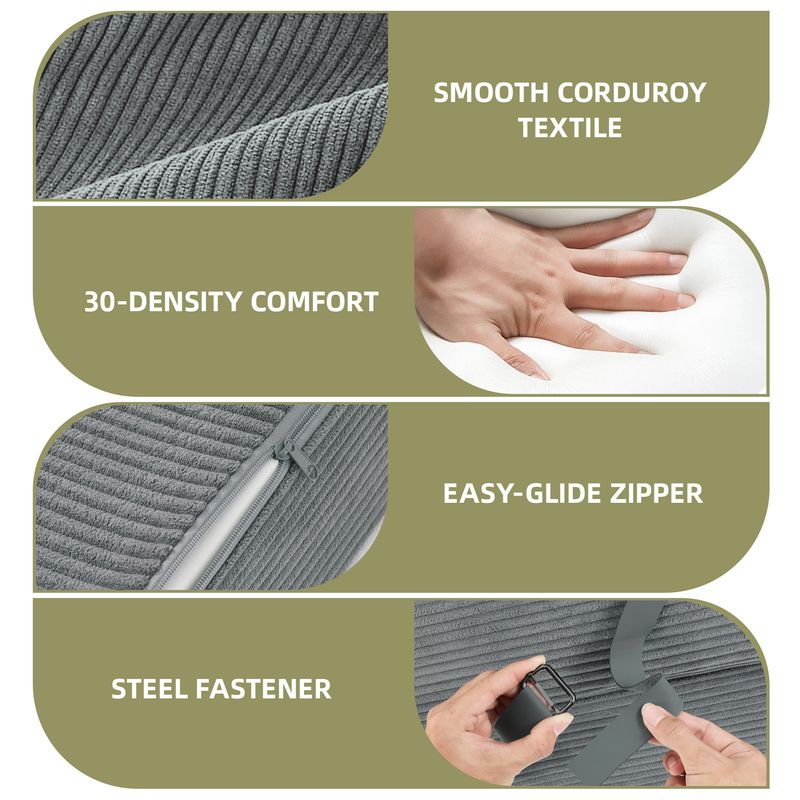 Soft corduroy upholstery with high-resilience 100% foam filling provides consistent support while maintaining shape over time, with removable machine-washable cover.