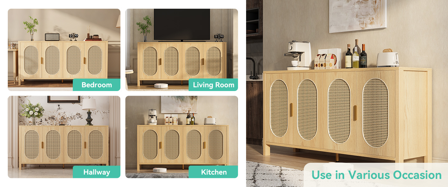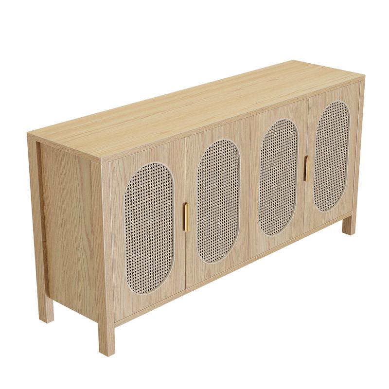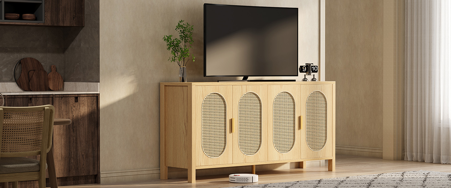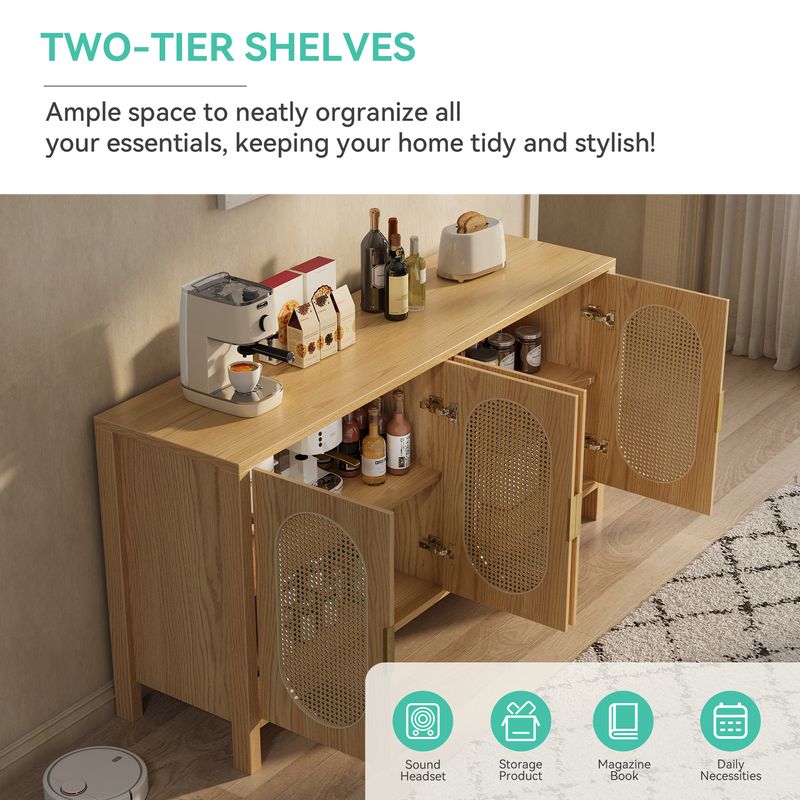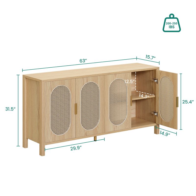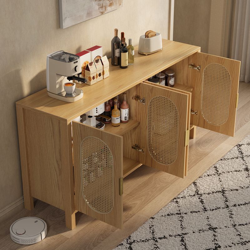Upgrade your space with this 63"W natural wood sideboard, blending sleek contemporary design with warm rattan accents. Perfect for dining rooms, living areas, or entryways, its 4 adjustable-shelf doors offer customizable storage for dishes, linens, or decor. The 16"D depth fits seamlessly against walls, while the 31.5"H height doubles as a stylish console.