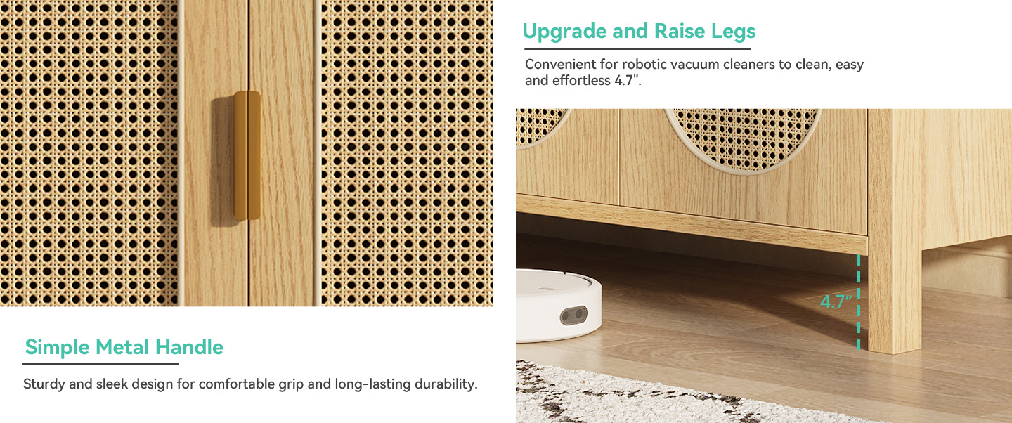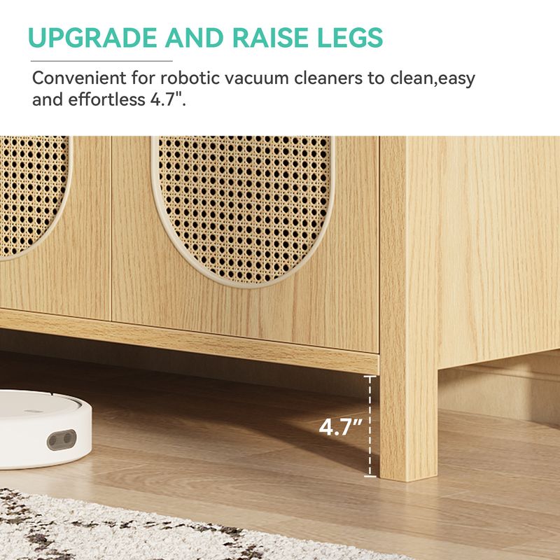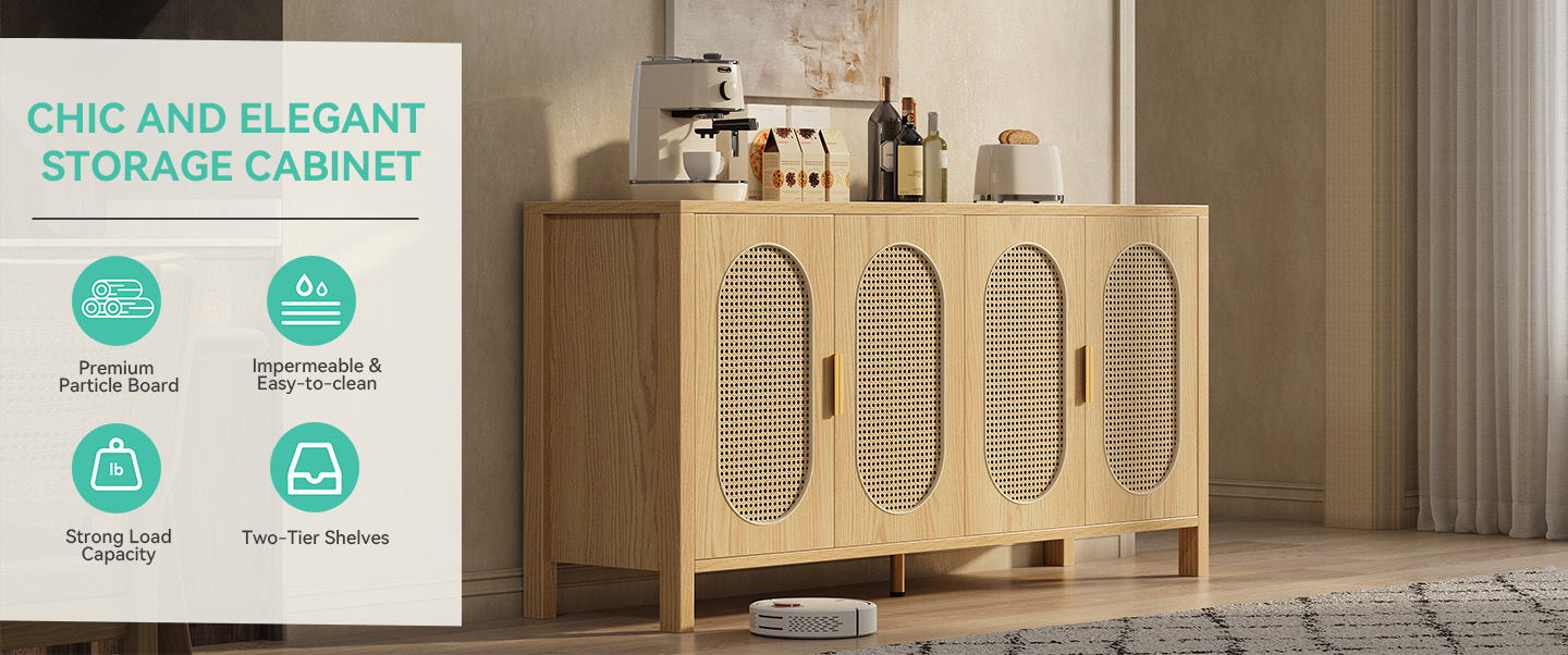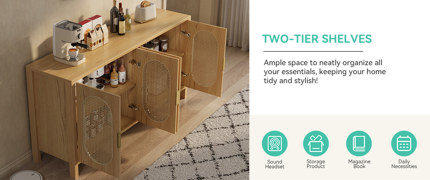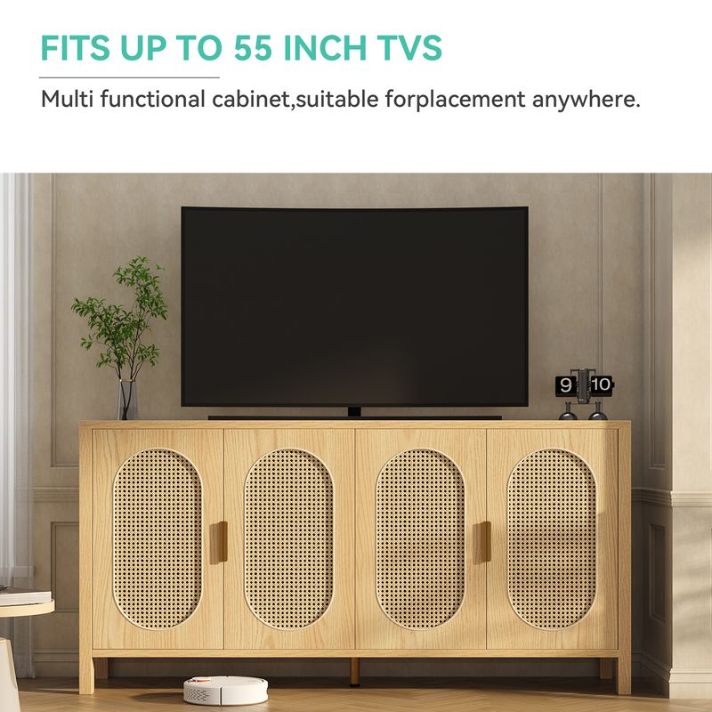 Upgrade your space with this 63"W natural wood sideboard, blending sleek contemporary design with warm rattan accents. Perfect for dining rooms, living areas, or entryways, its 4 adjustable-shelf doors offer customizable storage for dishes, linens, or decor. The 16"D depth fits seamlessly against walls, while the 31.5"H height doubles as a stylish console.