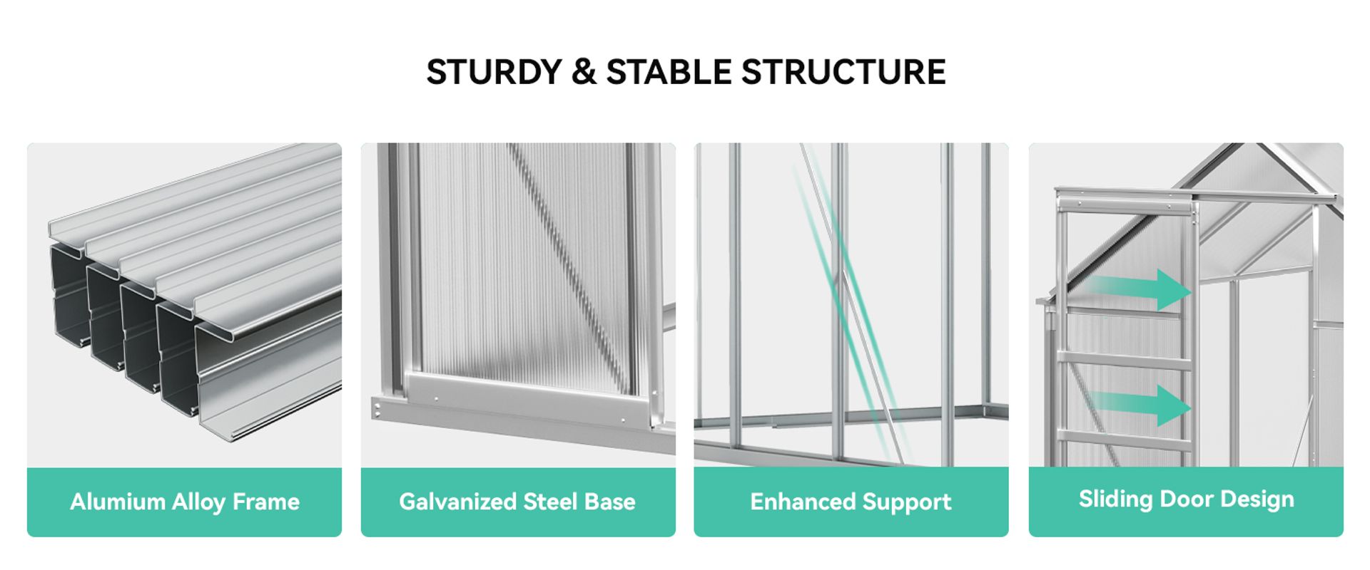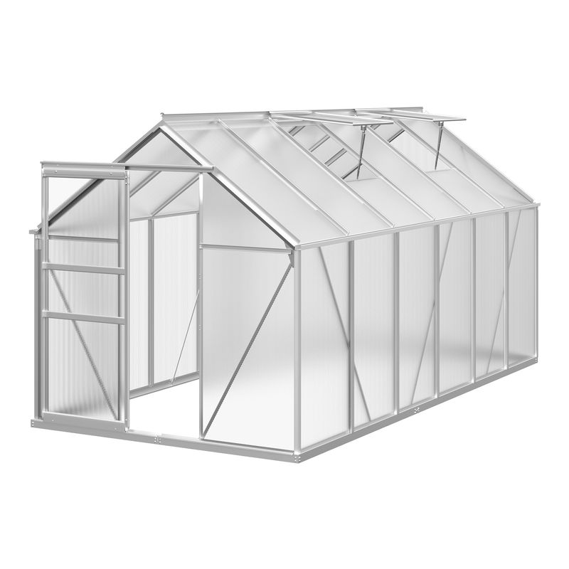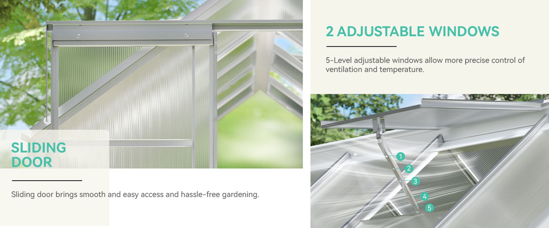 This premium polycarbonate greenhouse features a rust-proof aluminum frame and 4mm twin-wall panels that provide superior insulation, UV protection, and optimal light diffusion for year-round plant growth, with adjustable windows and a smooth-sliding door for perfect climate control.