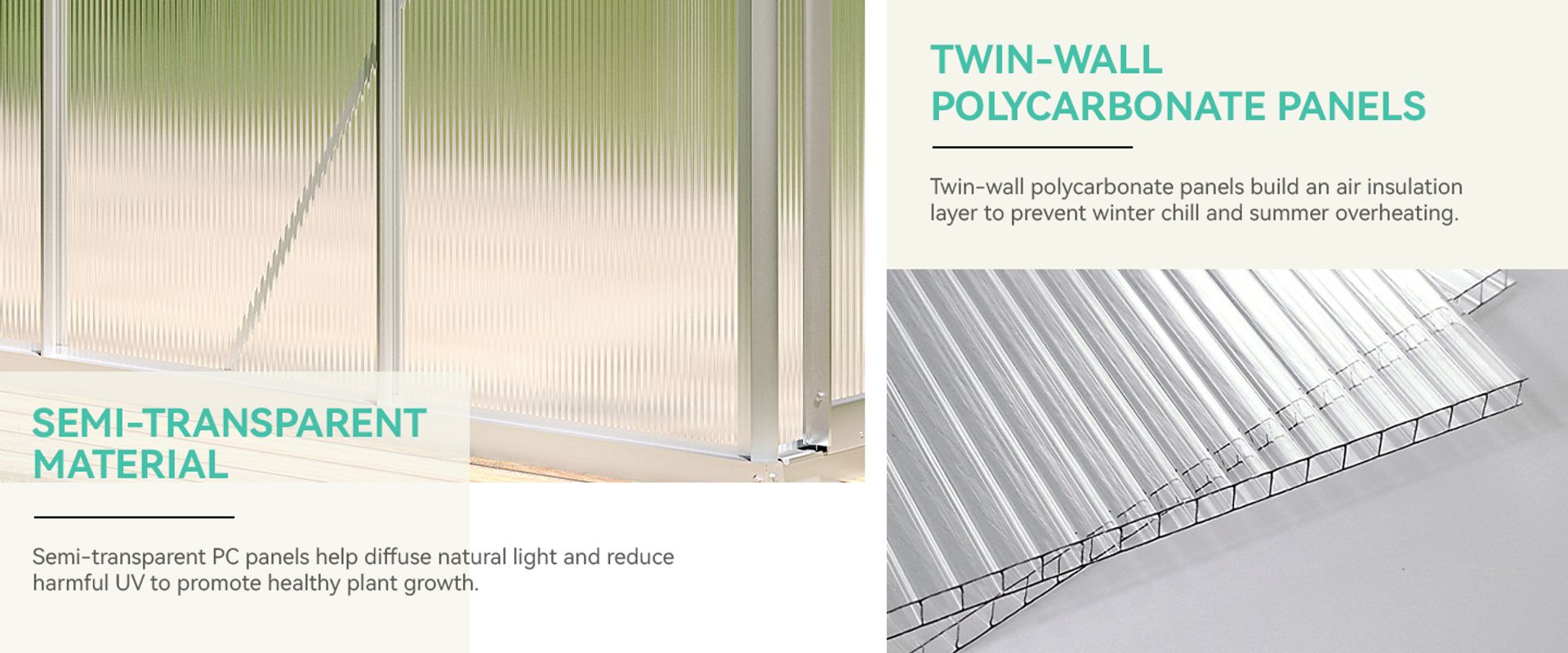 4mm twin-wall polycarbonate panels create an effective barrier against extreme temperatures while blocking 99% of harmful UV rays, ensuring ideal growing conditions.