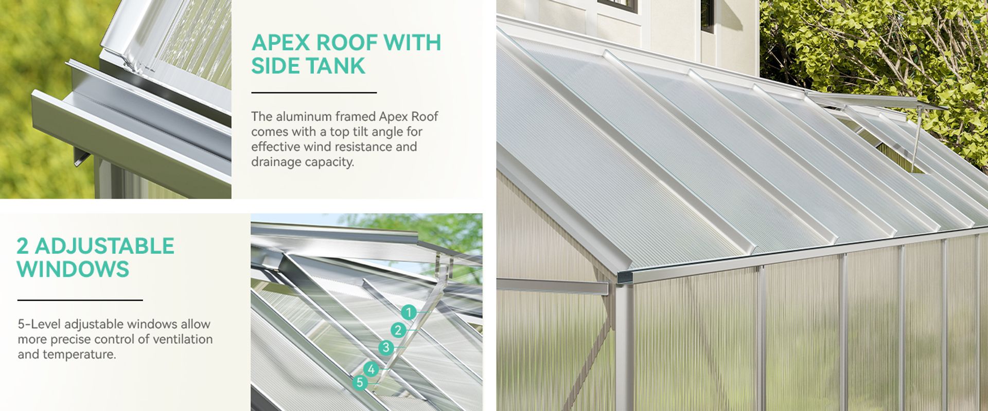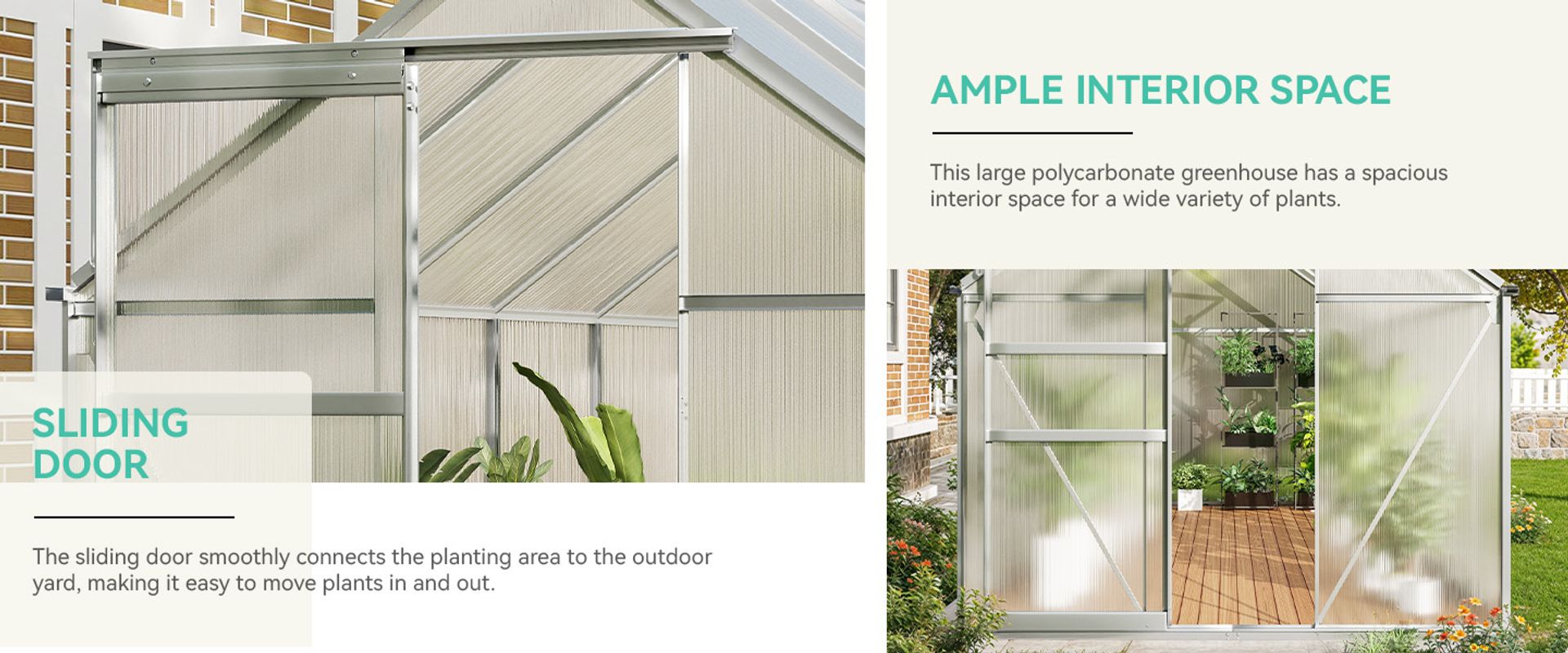 This premium polycarbonate greenhouse features a rust-proof aluminum frame and 4mm twin-wall panels that provide superior insulation, UV protection, and optimal light diffusion for year-round plant growth, with adjustable windows and a smooth-sliding door for perfect climate control.