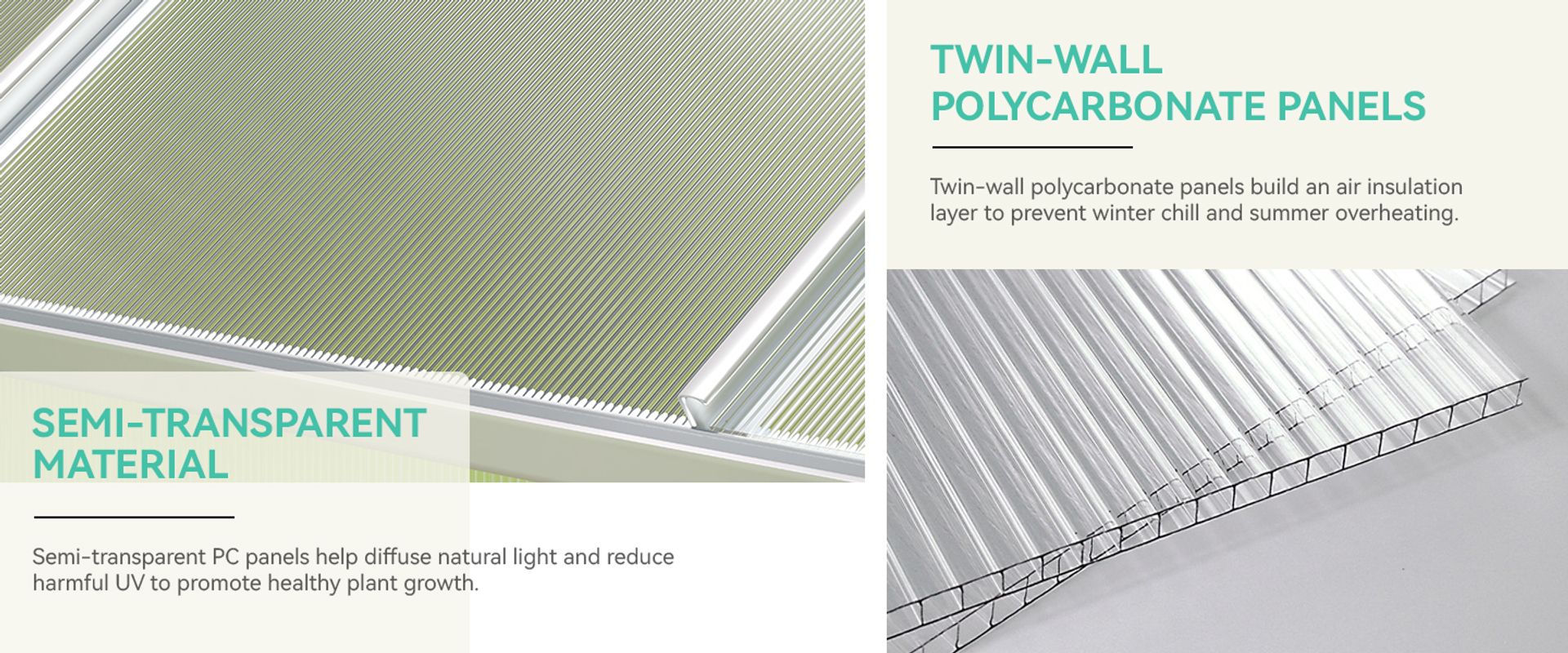 4mm twin-wall polycarbonate panels create an effective barrier against extreme temperatures while blocking 99% of harmful UV rays, ensuring ideal growing conditions.