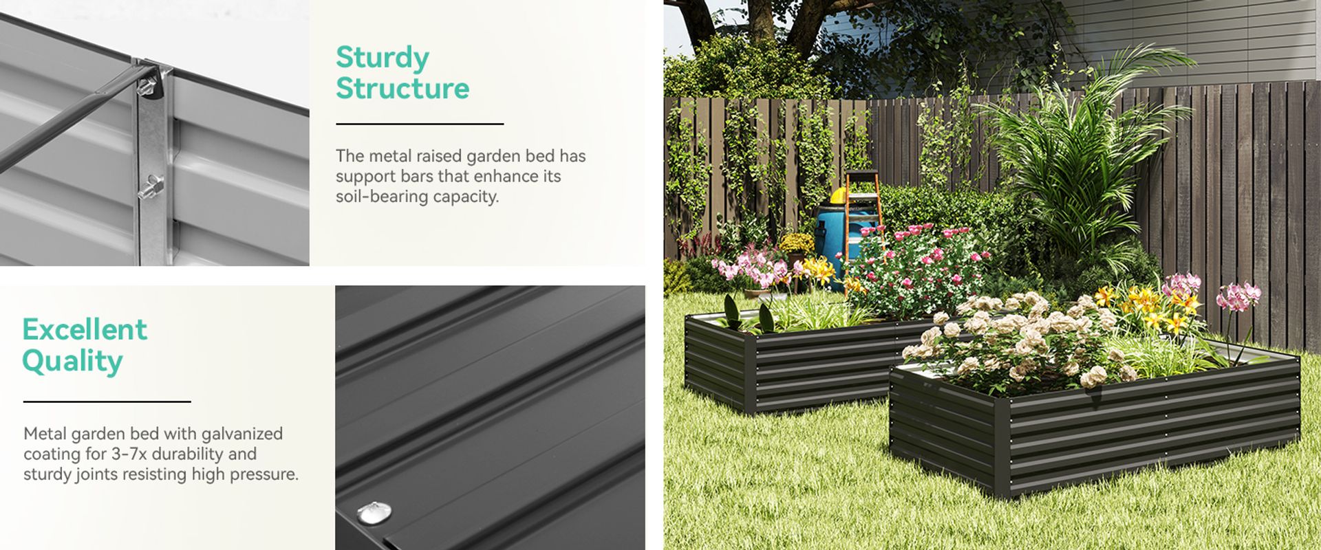 Our metal garden bed features a premium galvanized coating that boasts exceptional weather resistance, with a lifespan that’s 3-7 times longer than other products; The sturdy joints can withstand high pressure without loosening or deforming