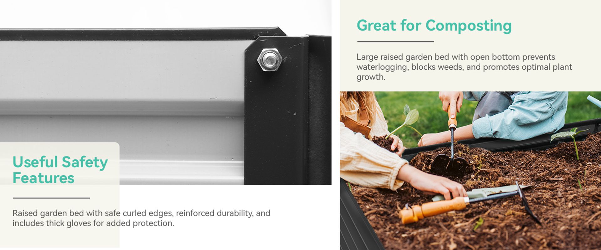 With four protective corners and a curled edge design, this raised garden bed provides enhanced safety; The overall reinforced construction provides added durability; The package includes two pairs of thick gloves for added protection while using our garden bed