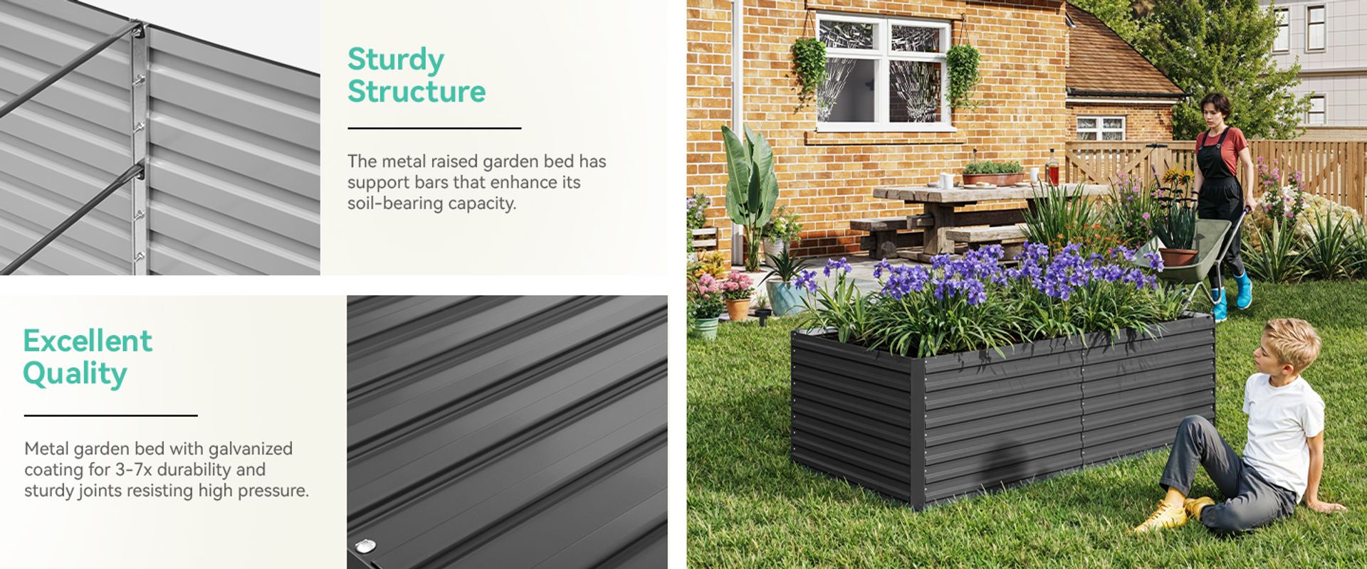 Our metal raised garden bed has support bars that enhance its soil-bearing capacity; The simple design facilitates a quick and easy installation