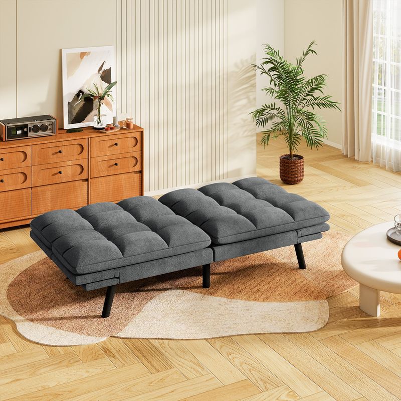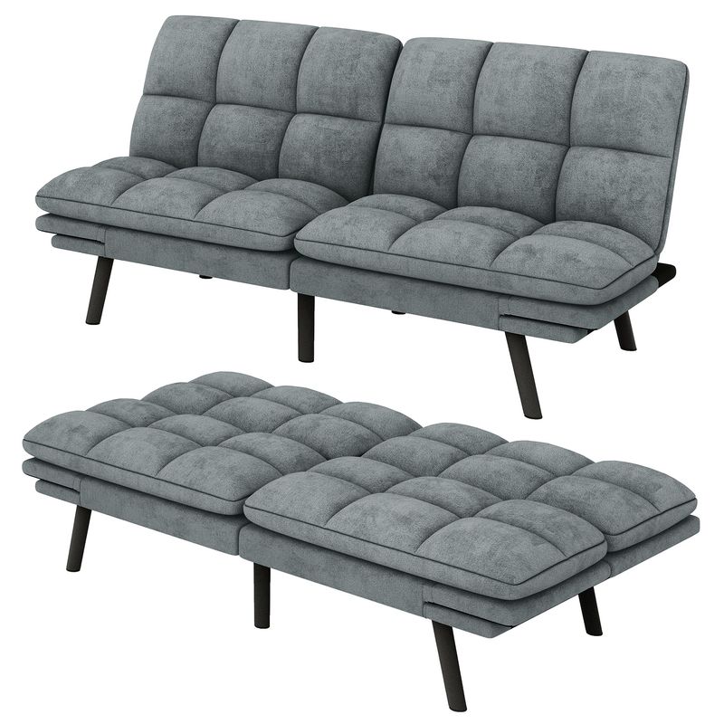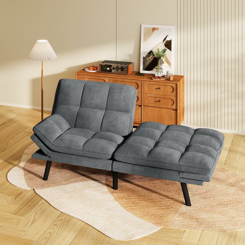 Compact footprint ideal for apartments and guest rooms, functioning as sofa, lounger, or bed while complementing modern decor in neutral grey.