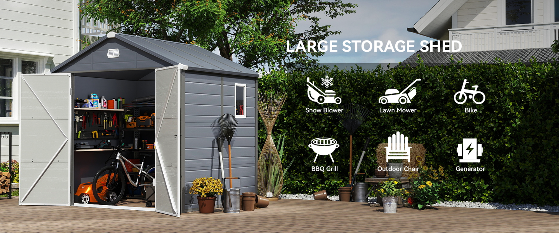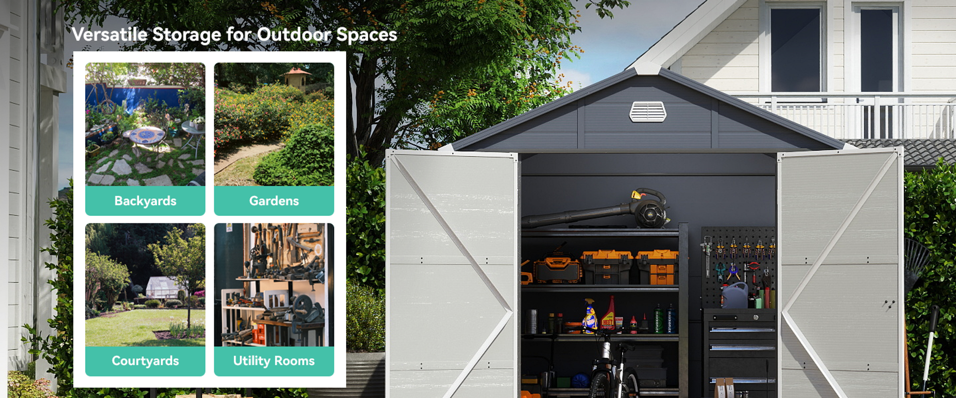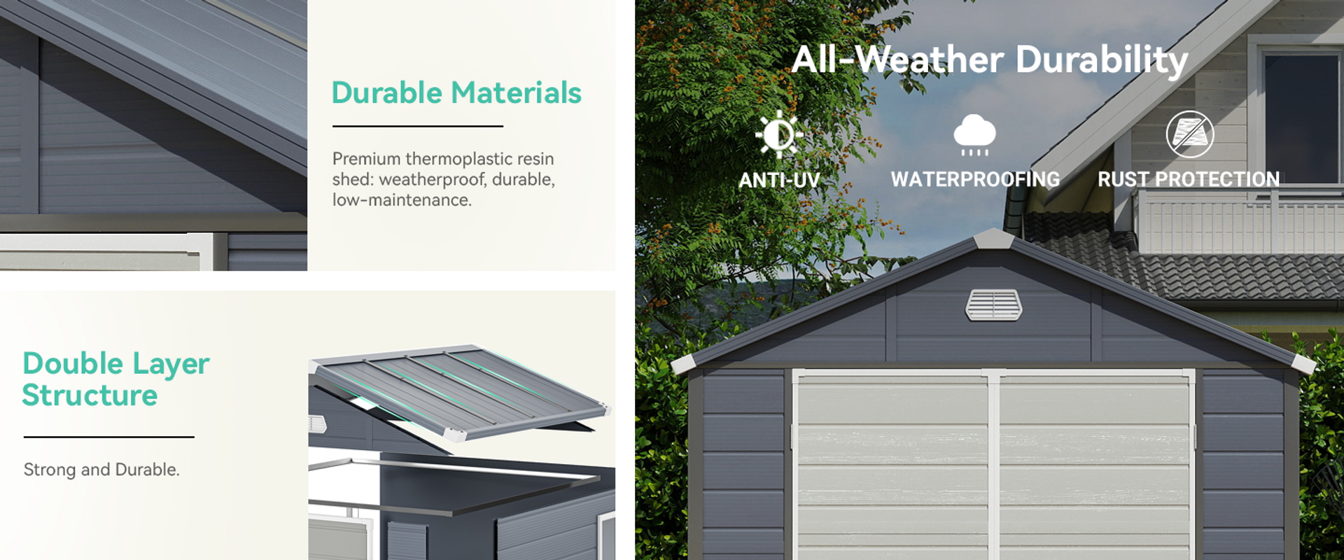 The backyard storage shed is constructed with a sturdy double-wall resin structure and a 0.6mm galvanized steel frame for extra longevity and resistance against external impact; It improves insulation inside the space for more stable temperatures