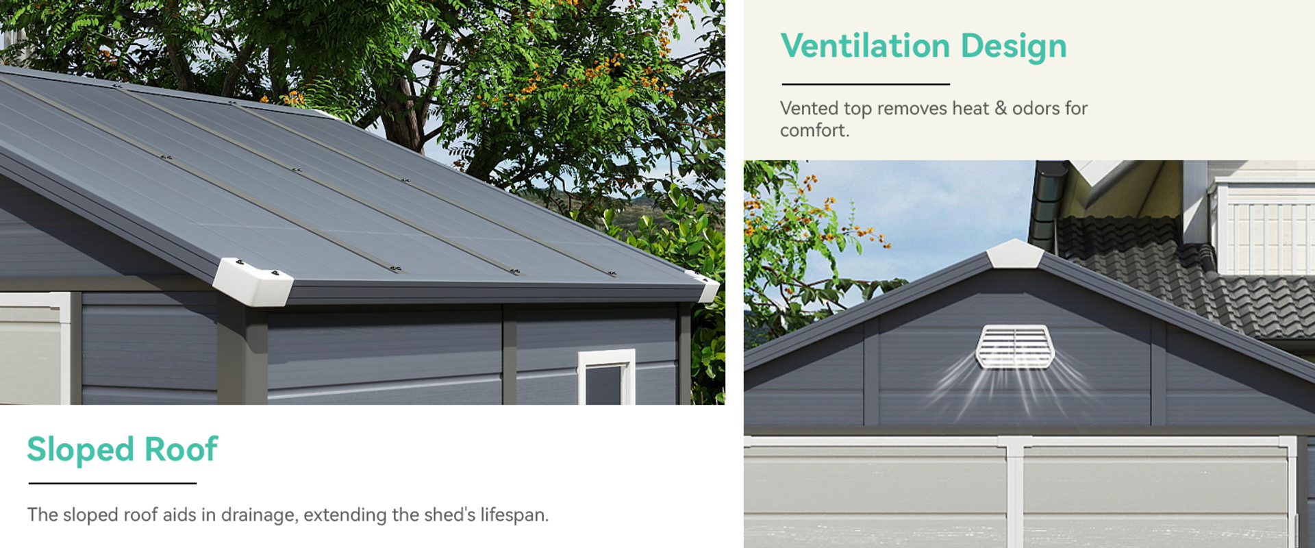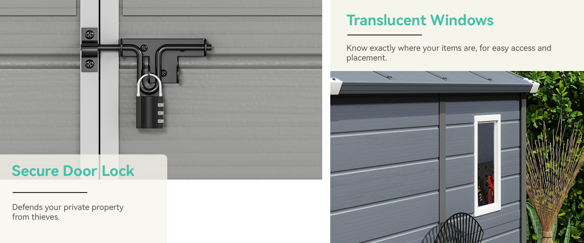 The shed features a lockable door for security and translucent side windows that allow natural light to brighten the interior. Louvered vents promote airflow and prevent water buildup, while the sloped roof aids in drainage, extending the shed's lifespan.