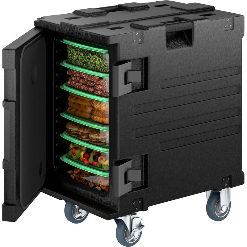 Insulated food pan carrier features a seamless double-wall shell that's made from highly heat and cold resistant LLDPE, inlaid sealing ring, and filled with premium polyurethane foam for maximum insulation performance; Ventilation holes on the door ensure perfect humidity before the food arrives