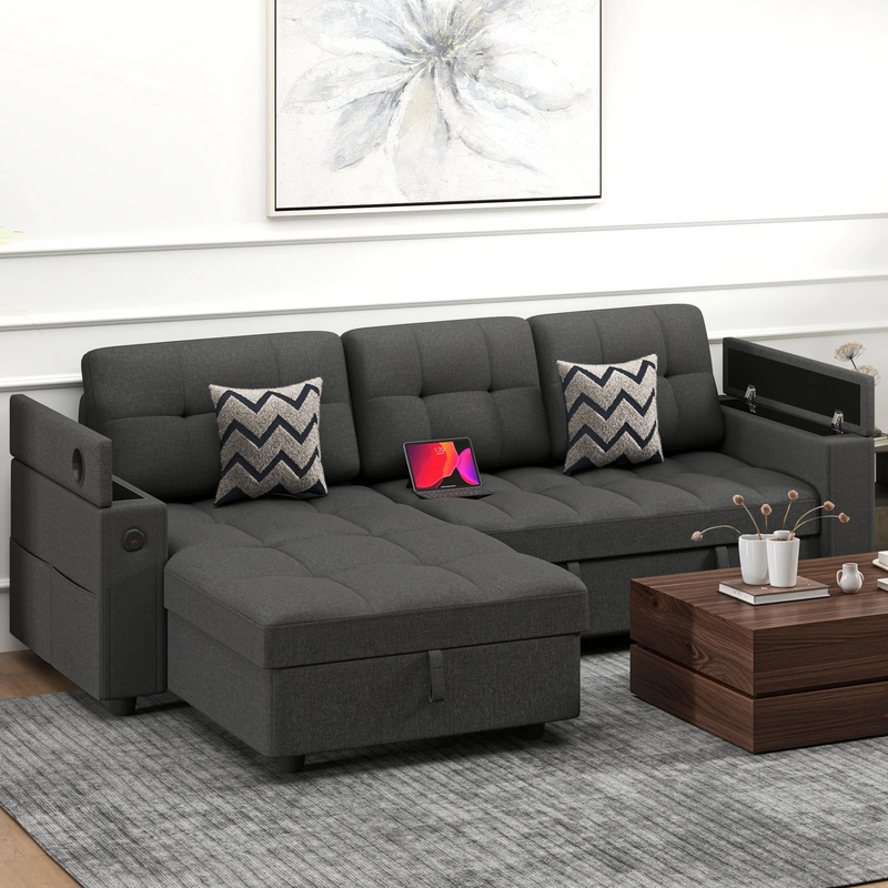 This versatile L-shaped sofa bed transforms from a 3-seater chaise to a full sleeper, featuring hidden storage, USB/Type-C charging ports, and premium linen upholstery over poplar plywood frame. With UL-certified power and scratch-proof legs, it maximizes space in any room.