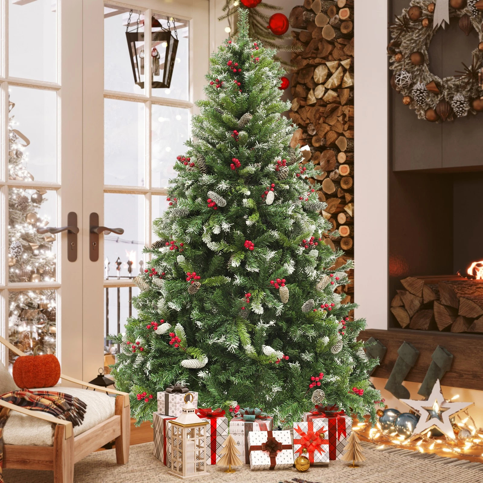 Revel in the vibrant and full presence of our 9ft pre-lit, pre-decorated pine hinged artificial Christmas tree, adorned with 2058 lush flocked frosted tips, 111 natural pine cones, and 111 vivid red berries for an enchanting holiday atmosphere.