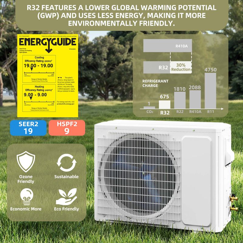 SEER 19 rated with inverter technology reduces energy costs by 25% compared to standard units, covering 450 sq ft effectively.