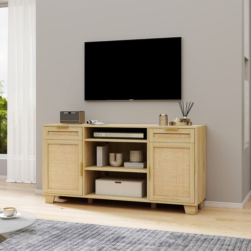 Boho TV stand with natural wood, rattan doors, and clean lines for a stylish, eclectic living space.