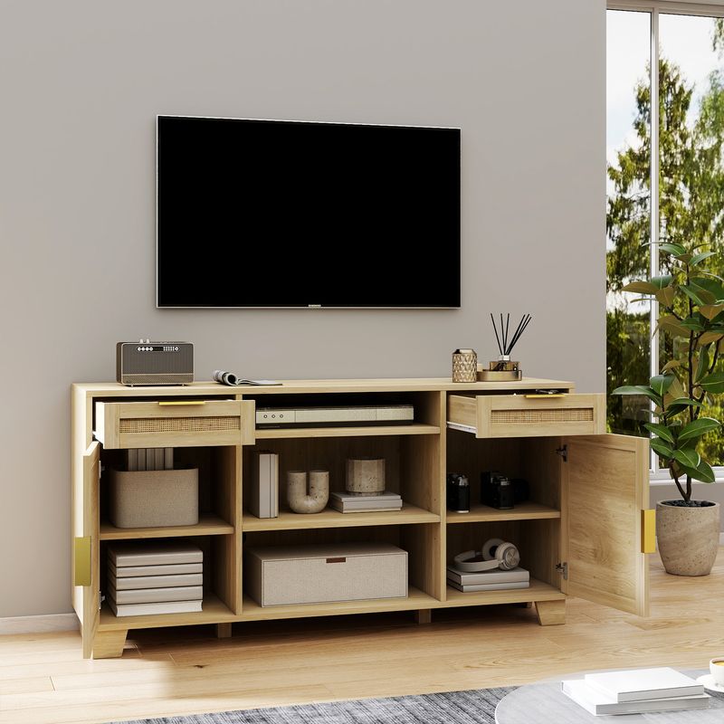 Upgrade your living room with this boho TV stand for up to 65" TVs. Features rattan door cabinets, 2 drawers, and an adjustable shelf for versatile storage. A stylish and functional entertainment center.